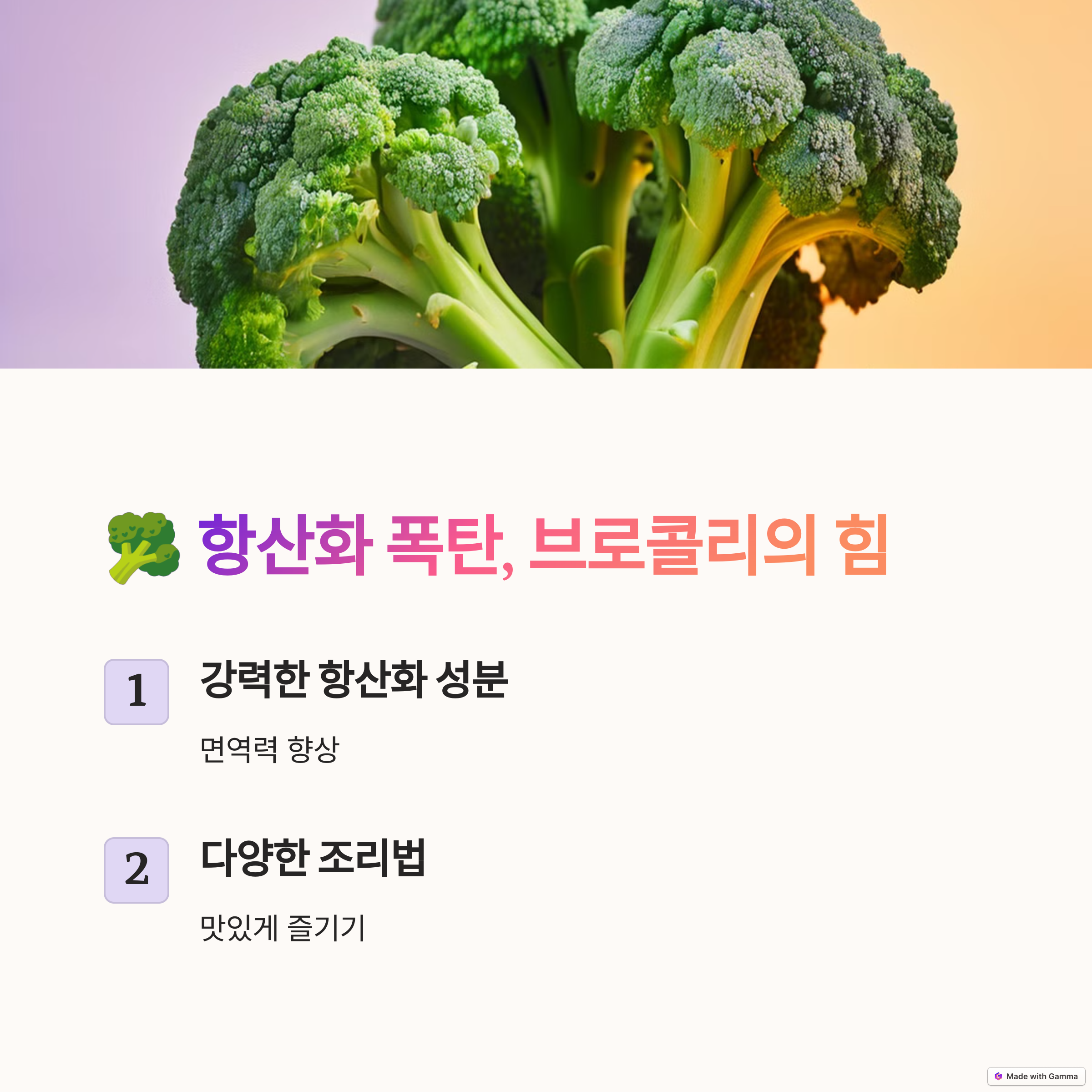 브로콜리는 강력한 해독 작용과 항산화 성분이 풍부해 면역력을 높이는 데 도움을 줍니다.