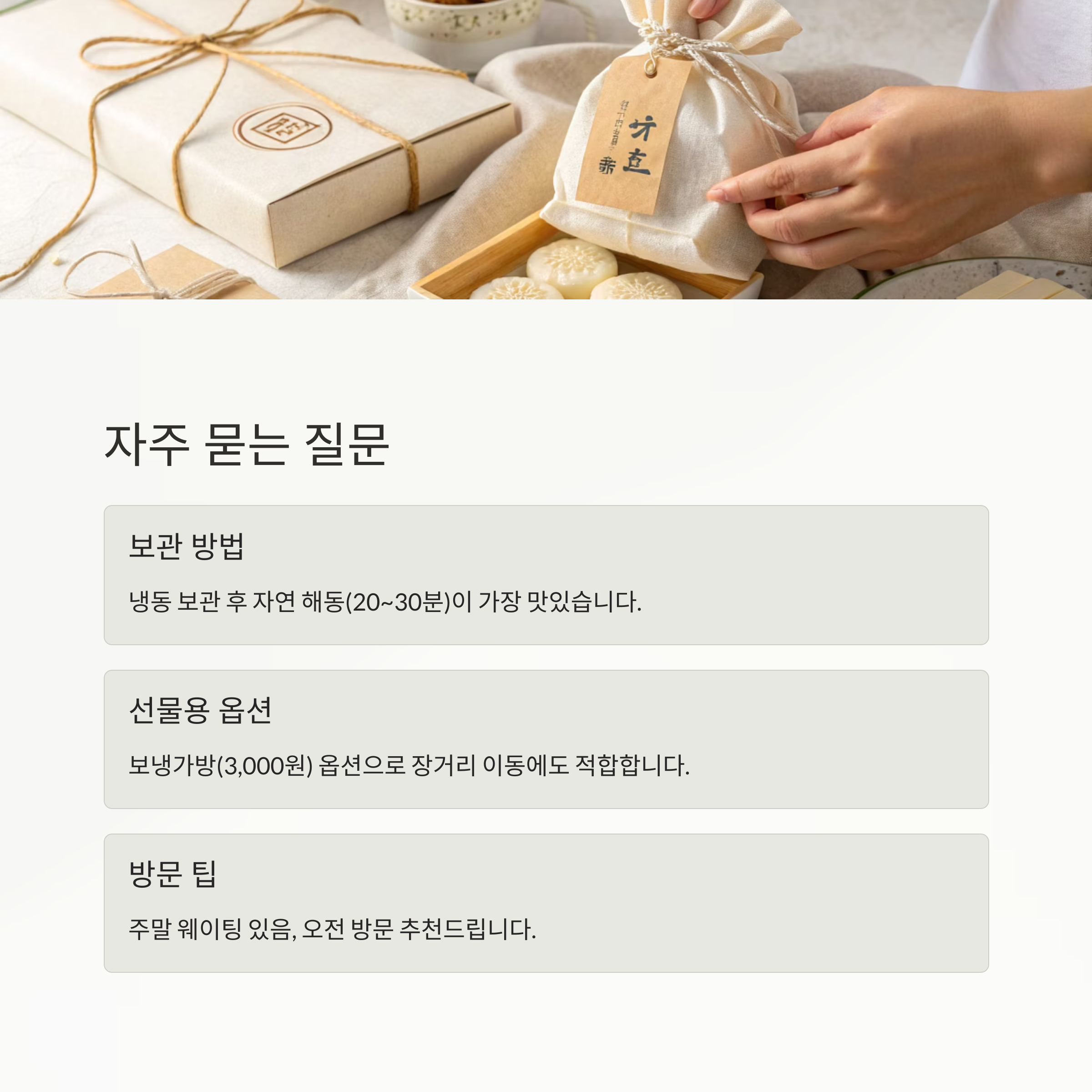 A: 보냉가방(3,000원) 옵션이 있어서 장거리 이동 시에도 적합합니다. - Q: 평일에도 사람이 많나요?