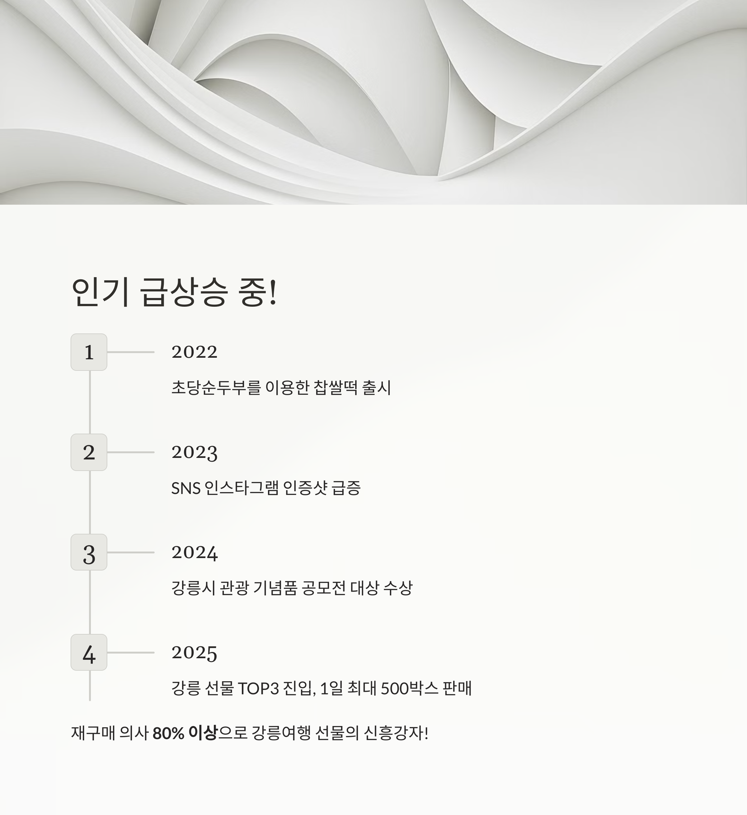 | 2025 | 강릉 선물 TOP3 진입, 1일 최대 500박스 판매 |