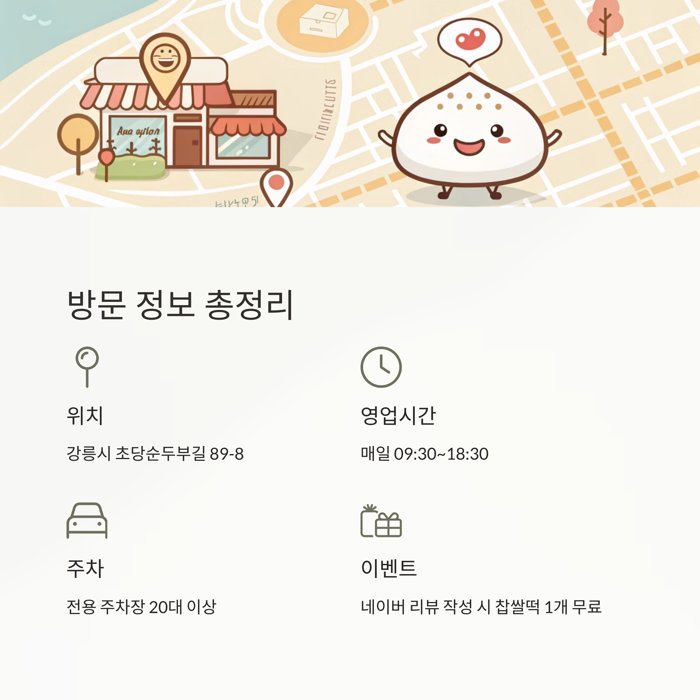 - 리뷰 이벤트: 네이버 리뷰 작성 시 찹쌀떡 1개 무료 증정