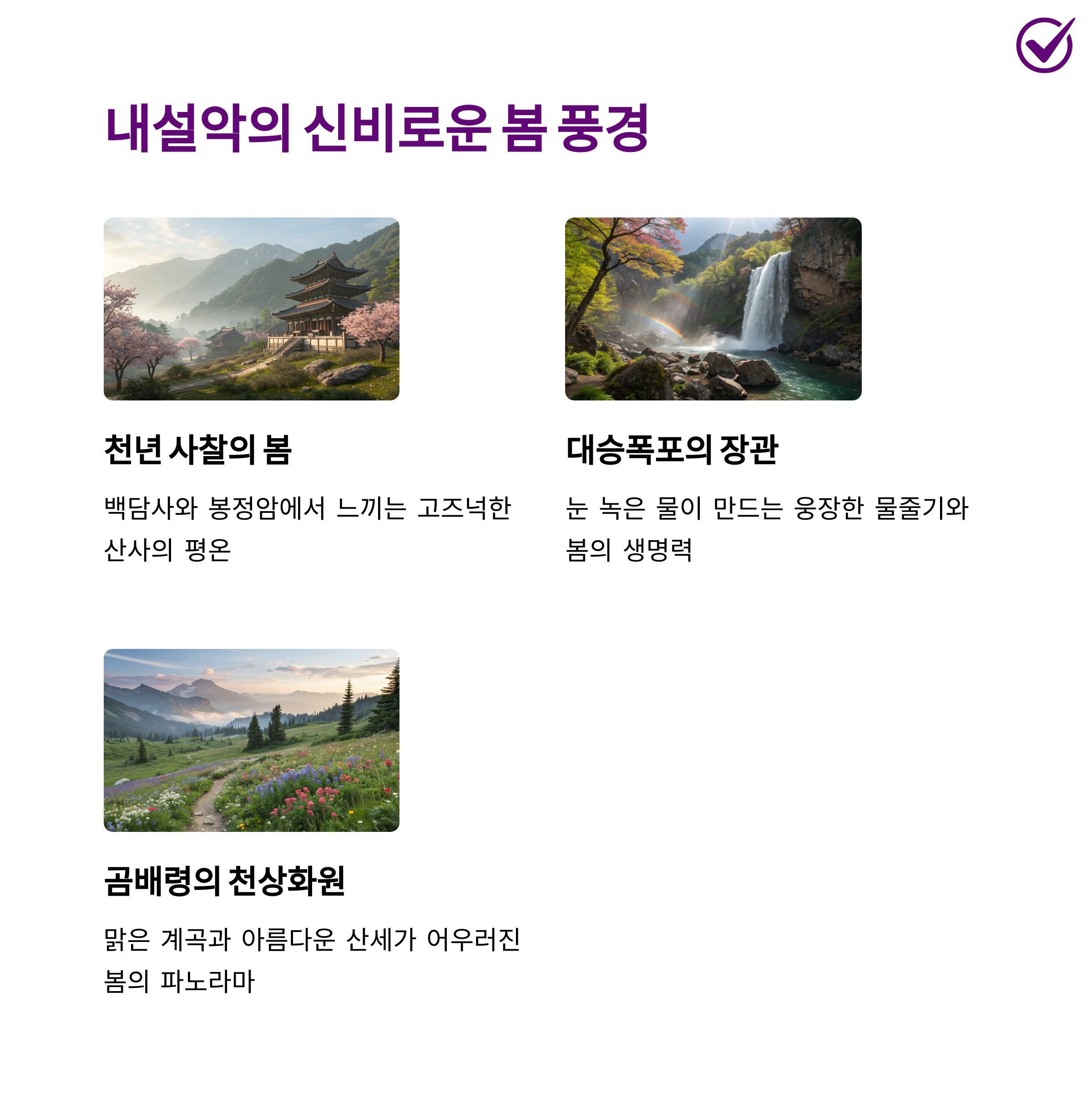 또한 봄에는 백담사를 놓칠 수 없습니다. 내설악의 평온한 풍경과 함께 조용히 산책하며 명상의 시간을 가져보세요.