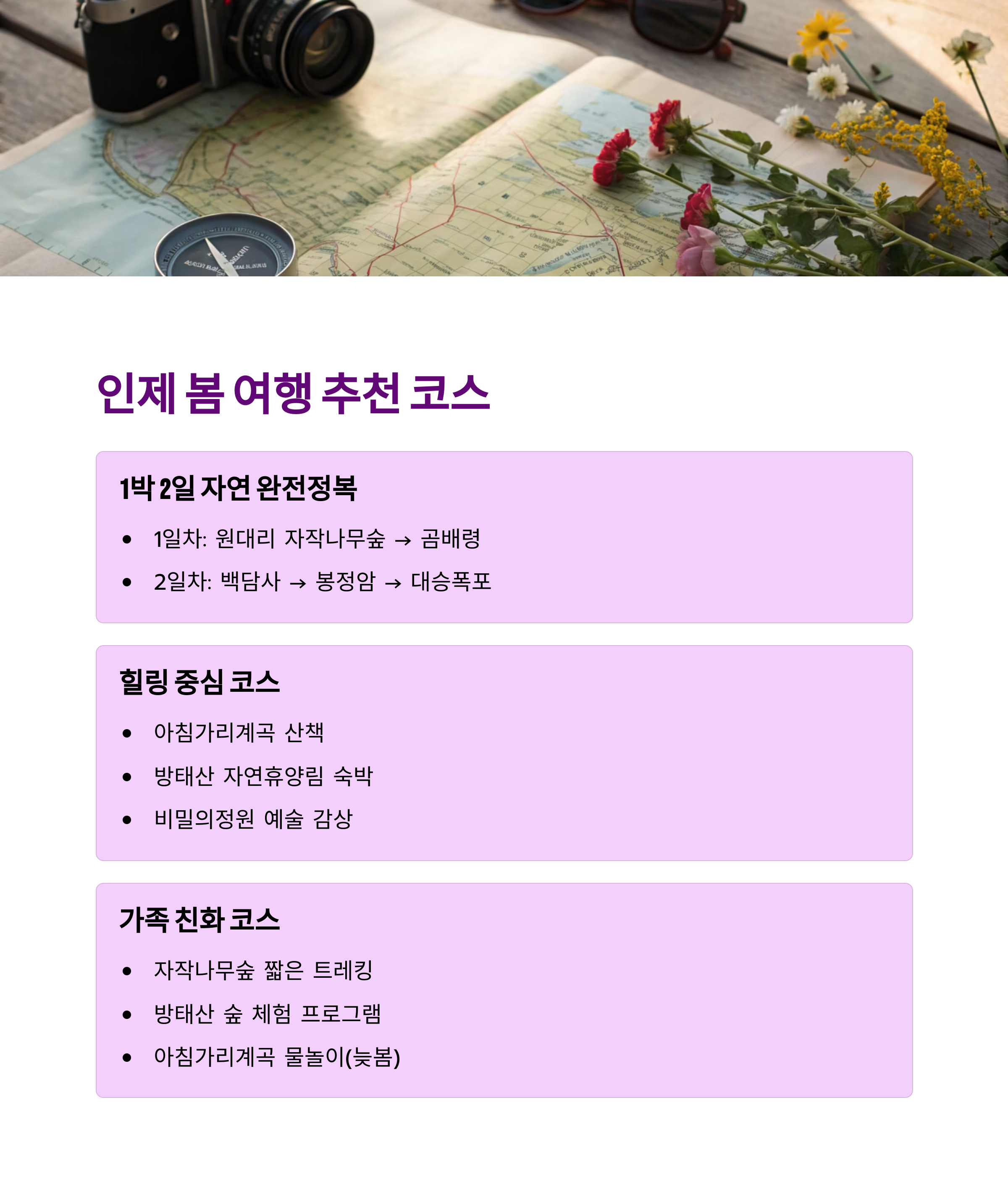 | Q. 봄철 인제에서 추천 코스 순서는 어떻게 되나요? |