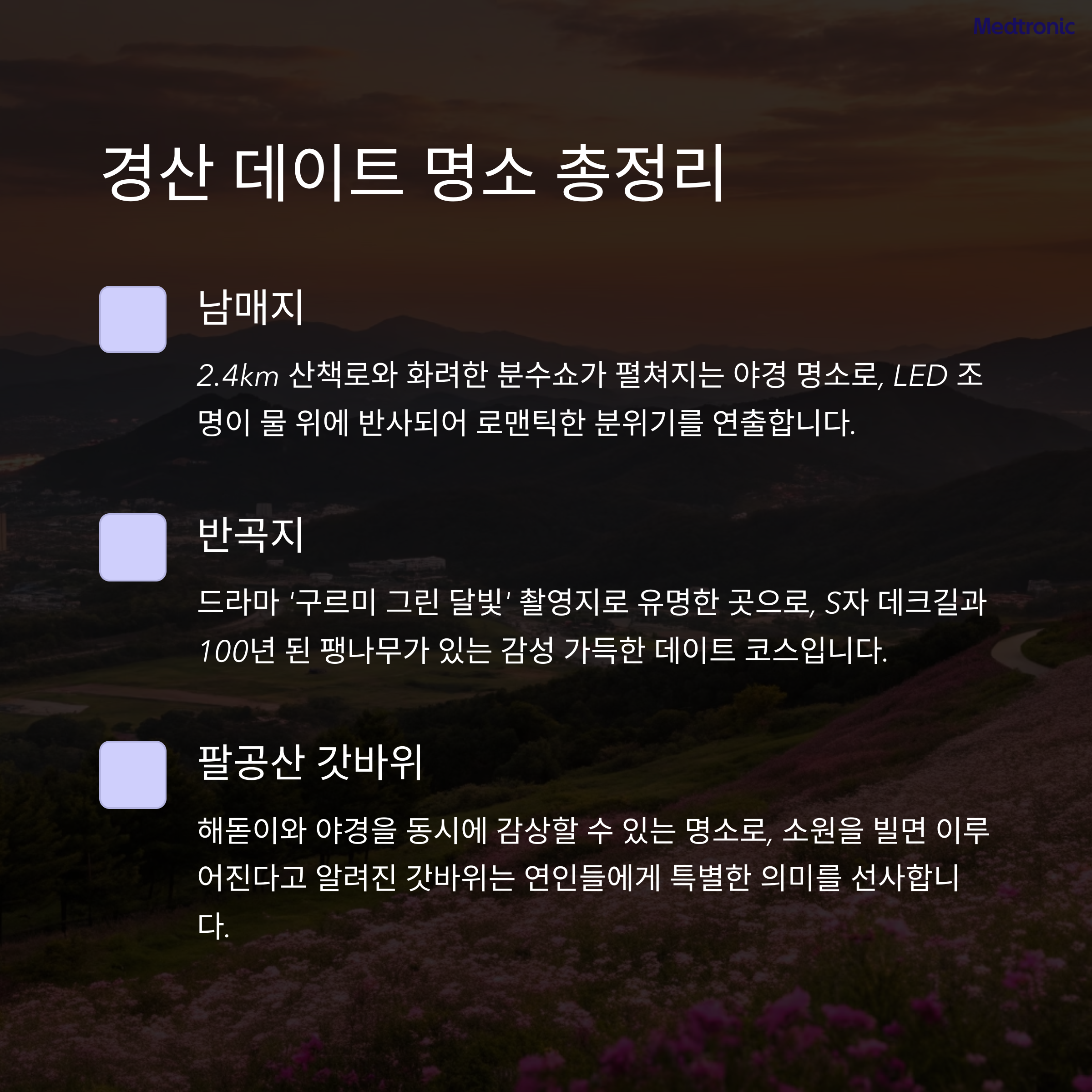 경산은 자연과 야경이 어우러진 점이 가장 큰 강점으로 꼽힙니다.