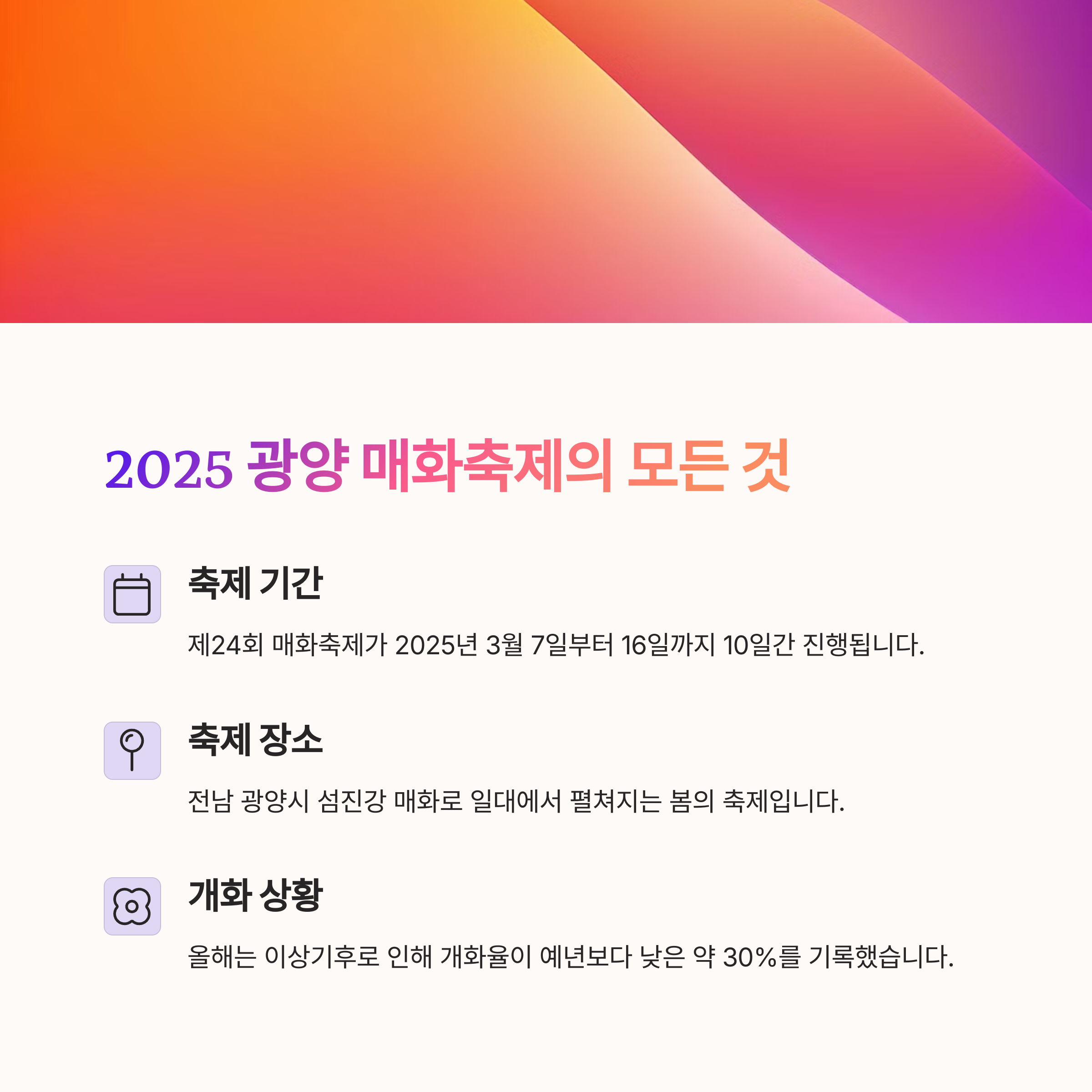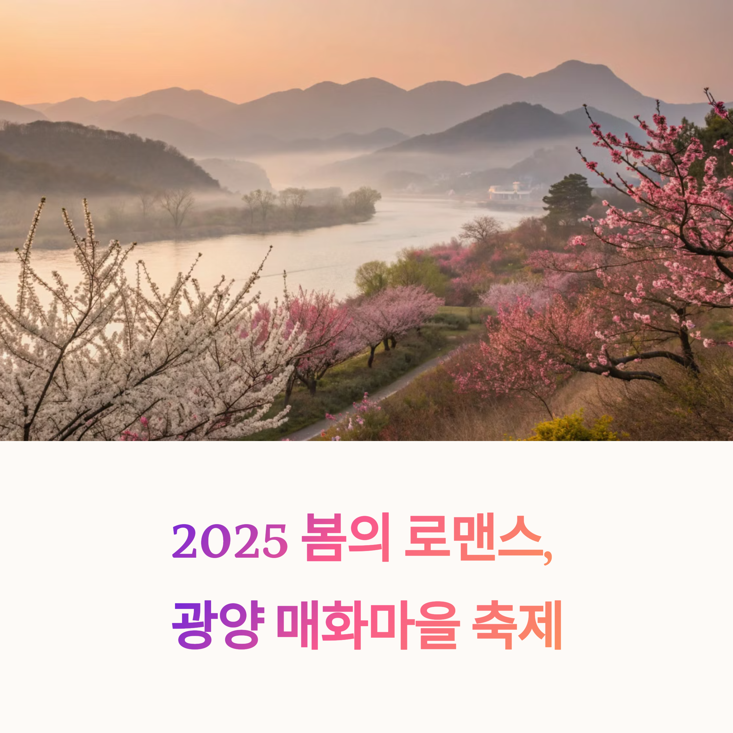 봄이 찾아오면 자연스럽게 떠오르는 축제 중 하나가 바로 광양 매화마을 축제입니다. 매년 3월 초, 전라남도 광양시 다압면 섬진강 매화로 일대가 온통 매화 향기로 가득 차면서 수많은 관광객들이 이곳을 찾습니다. 특히 2025년에는 제24회 축제가 성대하게 개최되어 약 40만 명이 방문하며 광양의 아름다움을 만끽했습니다. 다만, 예년 대비 방문객 수는 감소했으며, 이는 이상기후로 인한 개화율 저하가 주요 원인으로 분석됩니다. 하지만 광양시는 방문객들의 불편을 최소화하기 위해 다양한 교통 및 환경 관리를 시행하였으며, 방문객들은 실시간 개화 정보를 통해 최적의 시기에 방문하여 매화의 매력을 즐길 수 있었습니다. 이번 포스팅에서는 광양 매화마을 축제의 핵심 정보는 물론, 아름다운 사진 스팟과 즐길 거리까지 자세히 안내해드릴 예정입니다. 봄의 시작을 알리는 이 아름다운 축제를 준비하는 여러분께 유익한 정보가 되길 바랍니다.