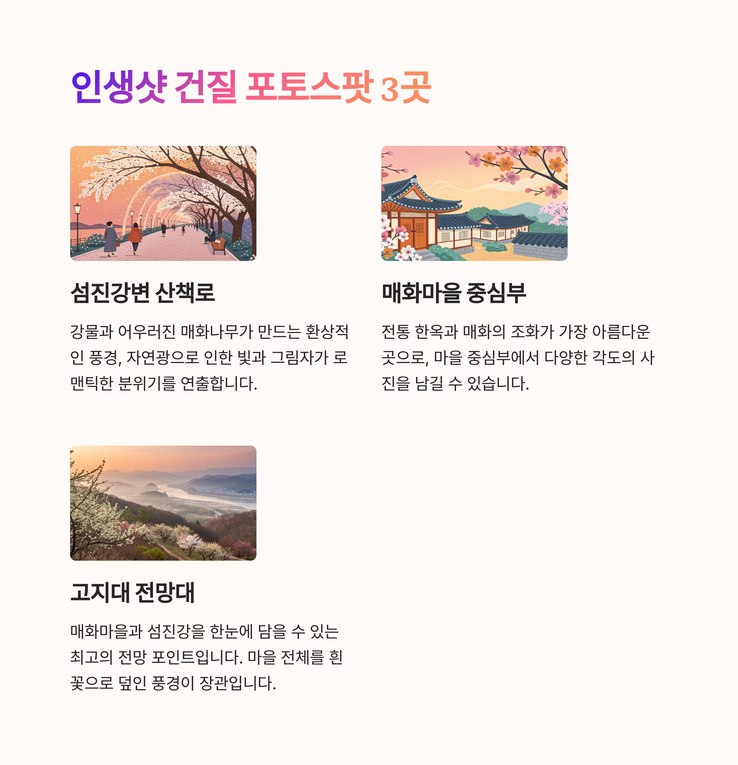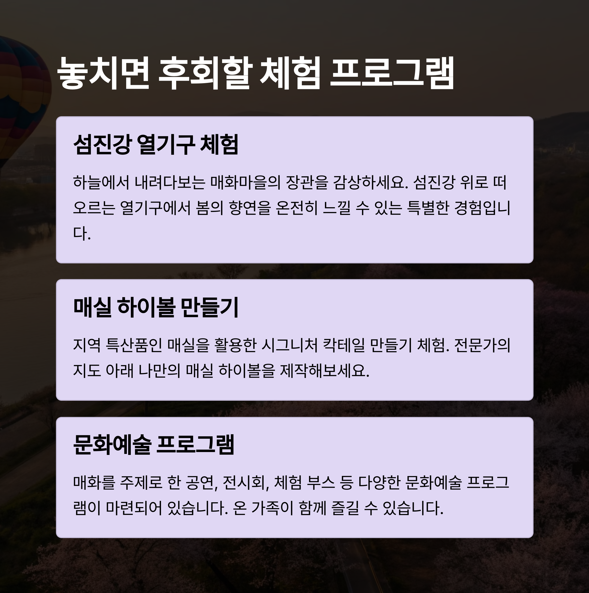 광양 매화마을에는 방문객들이 즐길 수 있는 다양한 사진 스팟이 있습니다. 섬진강변 산책로에서는 매화꽃과 강물이 어우러진 아름다운 풍경을 담을 수 있고, 마을 중심부에서는 만개한 매화를 가까이서 촬영할 수 있습니다. 특히 고지대 전망대에서는 매화마을 전체를 한눈에 내려다볼 수 있어 많은 사진 작가들과 관광객들의 사랑을 받는 명소입니다. 축제 프로그램으로는 열기구 체험, 요트 체험, 매실 하이볼 만들기 등이 마련되어 있어, 꽃 구경과 더불어 다채로운 즐거움을 선사합니다.