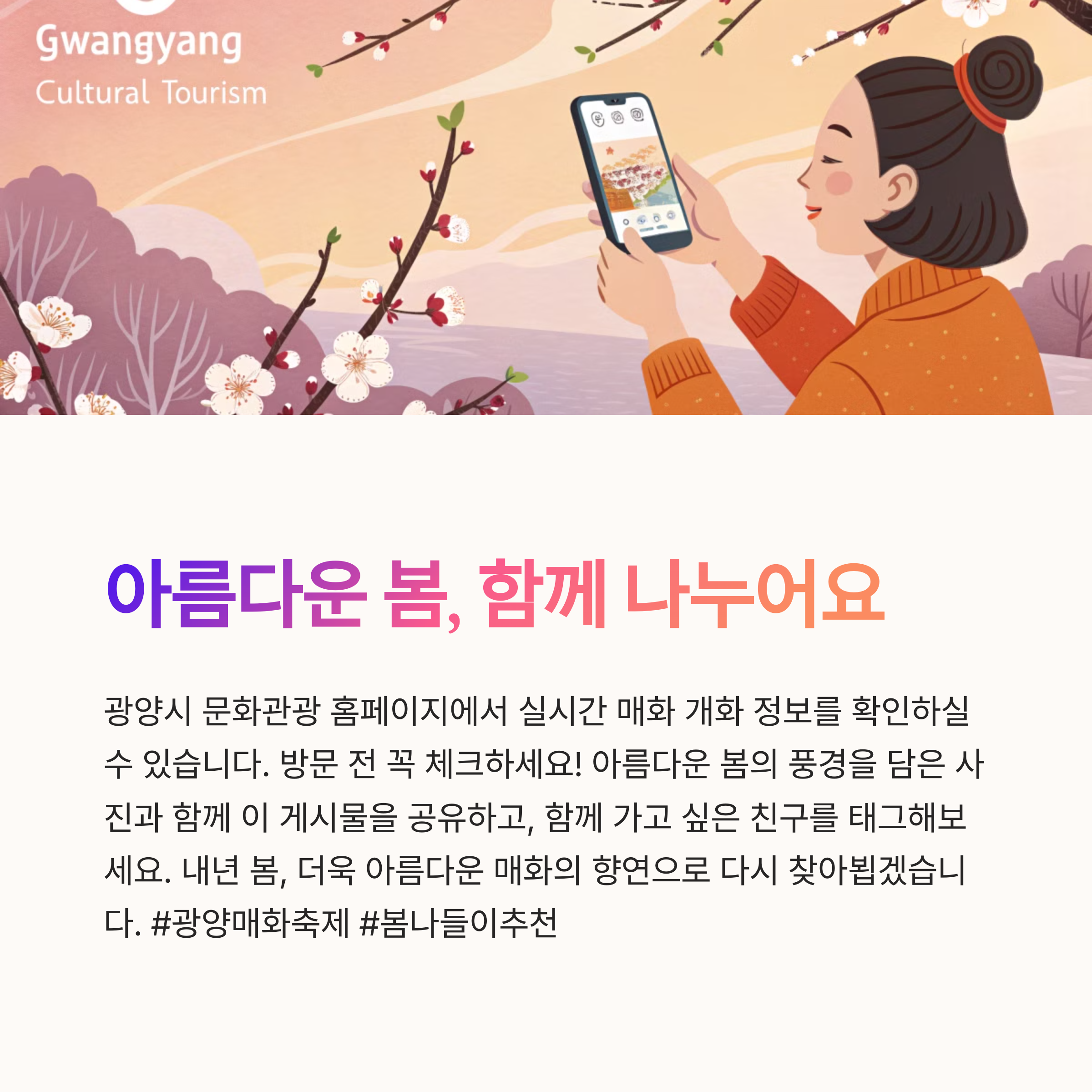 광양 매화마을 축제는 그 자체로 봄의 설렘을 느낄 수 있는 소중한 시간입니다. 다소 아쉬웠던 개화율에도 불구하고 축제장을 찾은 많은 방문객들은 자연 속에서 봄의 아름다움을 만끽했습니다. 축제 기간 동안 광양시는 방문객들의 편의를 위해 무료 셔틀버스와 실시간 개화 정보 서비스를 제공하며 즐거움을 더했습니다. 방문을 계획 중이시라면, 광양시 문화관광 홈페이지를 통해 실시간 정보를 확인하고 매화의 만개 시기에 맞춰 방문하길 추천드립니다. 아름다운 매화꽃과 함께 즐거운 추억을 만들 수 있는 광양 매화마을 축제에서 봄의 시작을 알리는 특별한 시간을 보내시길 바랍니다.