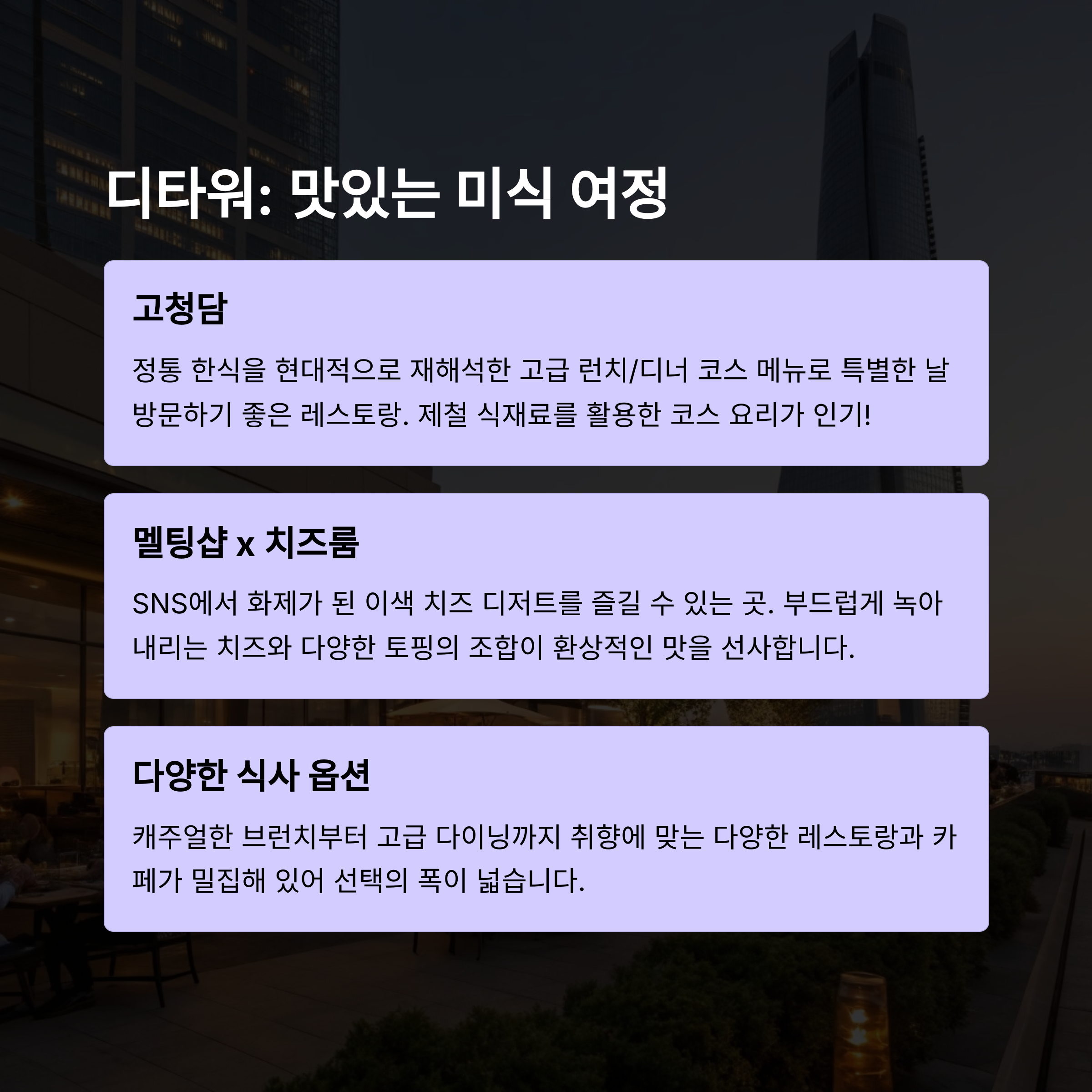 이후 방문할 디타워 맛집은 저마다 특색 있는 인테리어와 메뉴로 미식가들을 만족시키기에 충분합니다.