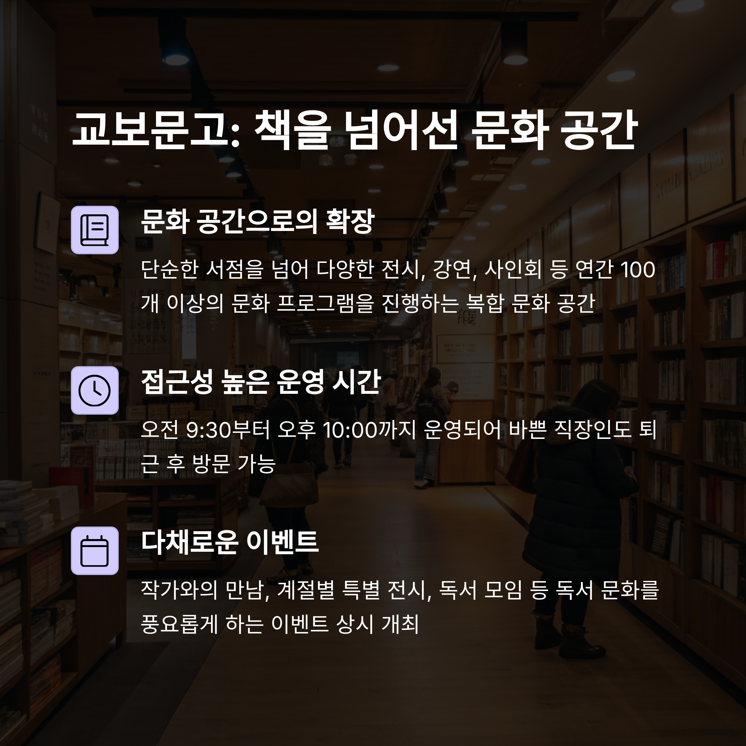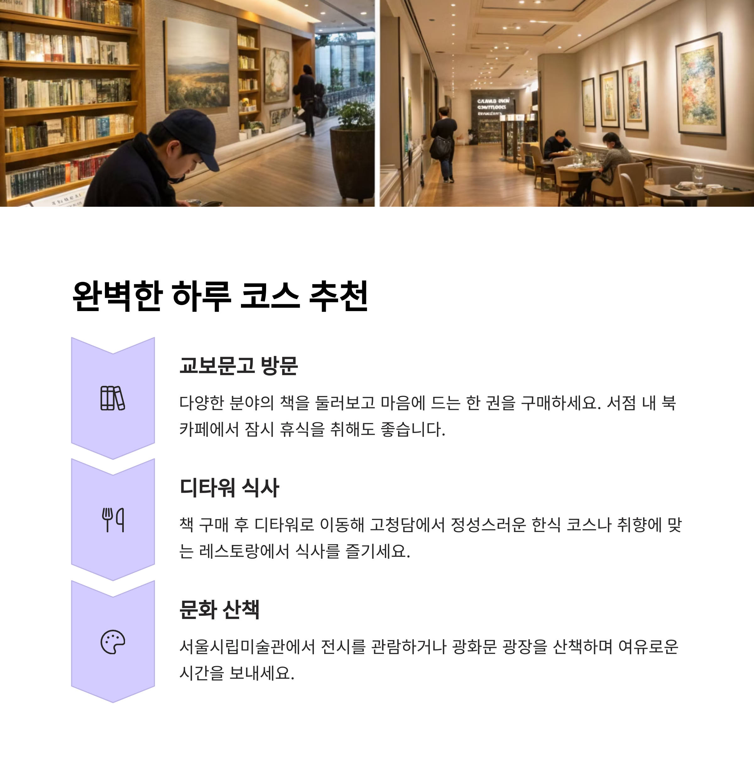 특히 교보문고에서의 독서 뒤 맛있는 식사를 이어가는 코스는 잊지 못할 추억을 선사할 것입니다.