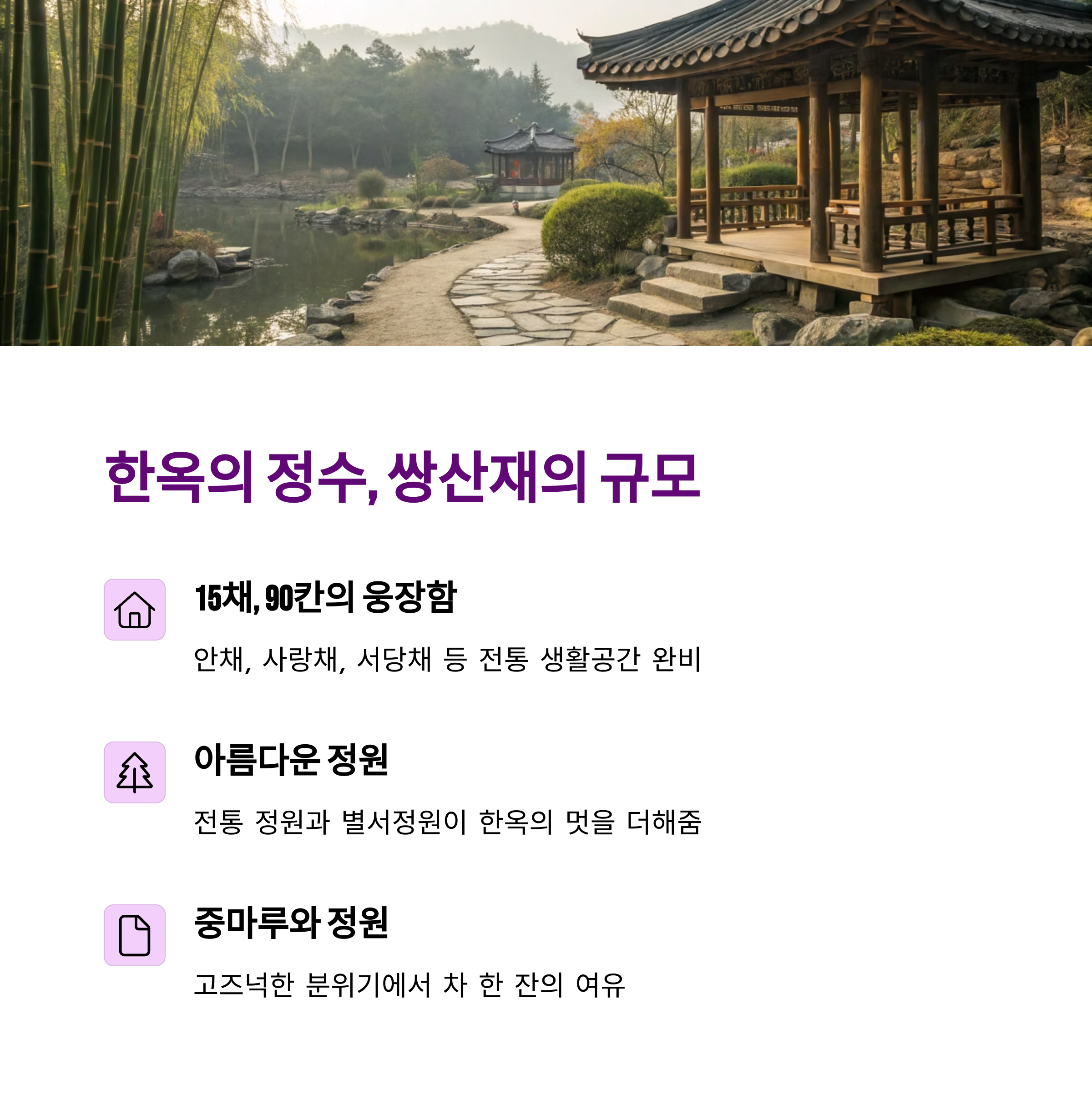 구례 쌍산재는 한옥이 가진 전통적 매력과 자연이 주는 고요함을 동시에 느낄 수 있는 장소입니다.
