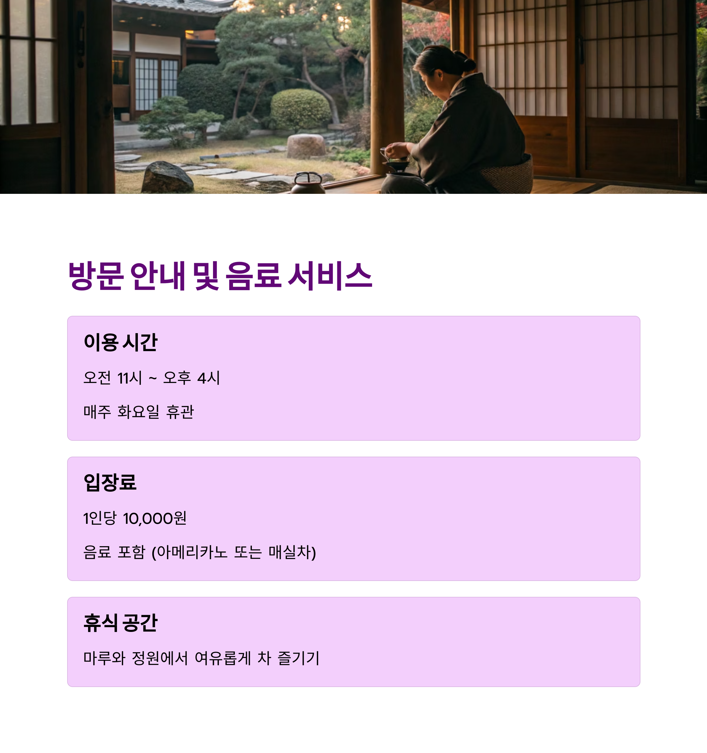 특히 대나무 숲길과 햇살이 반짝이는 마루에서의 음료 한 잔은 마치 시간이 멈춘 듯한 고요한 감각을 선사합니다.