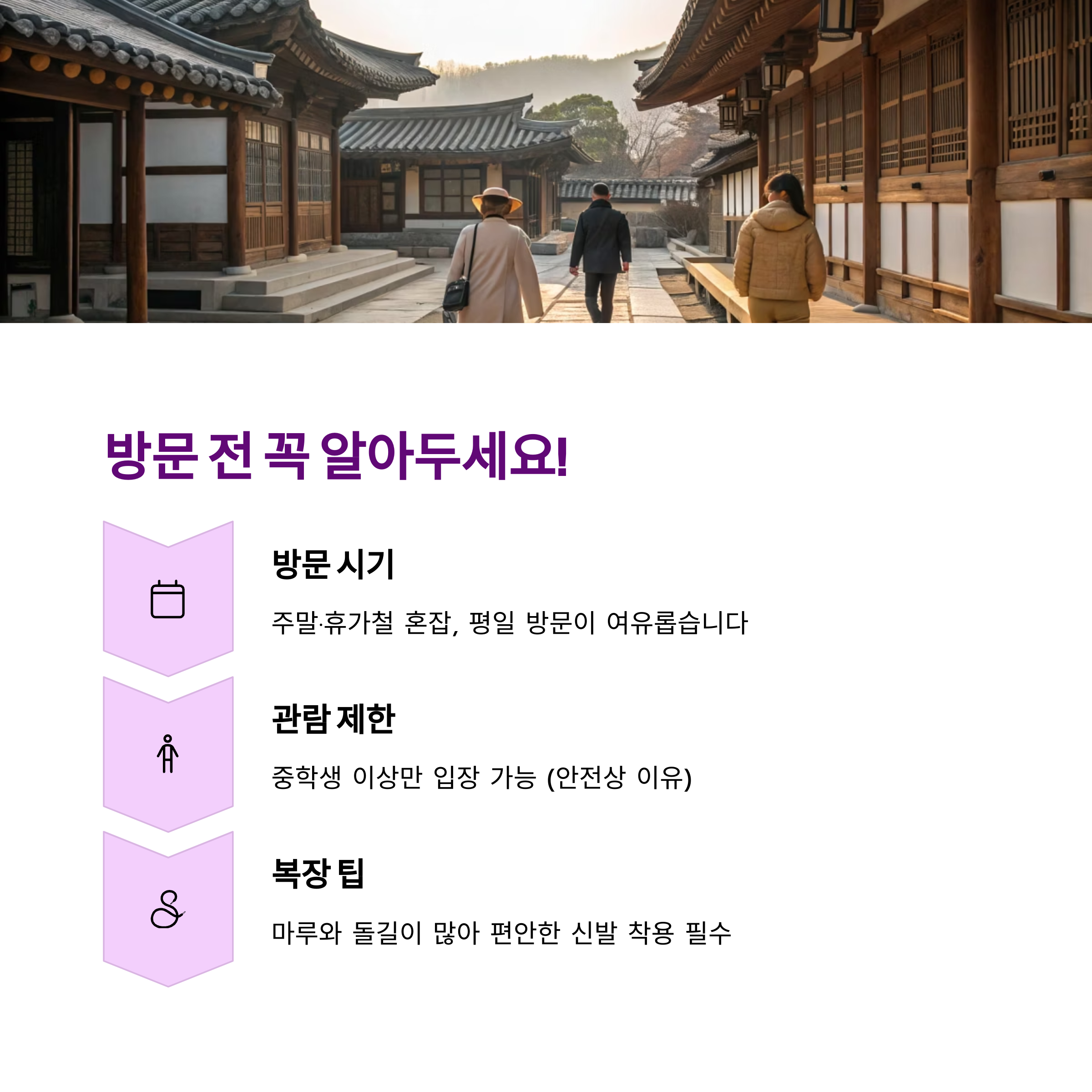 주말이나 휴일에는 관광객이 몰리기 때문에 여유롭게 한옥을 즐기고 싶은 분들에게는 평일 방문을 추천드립니다.