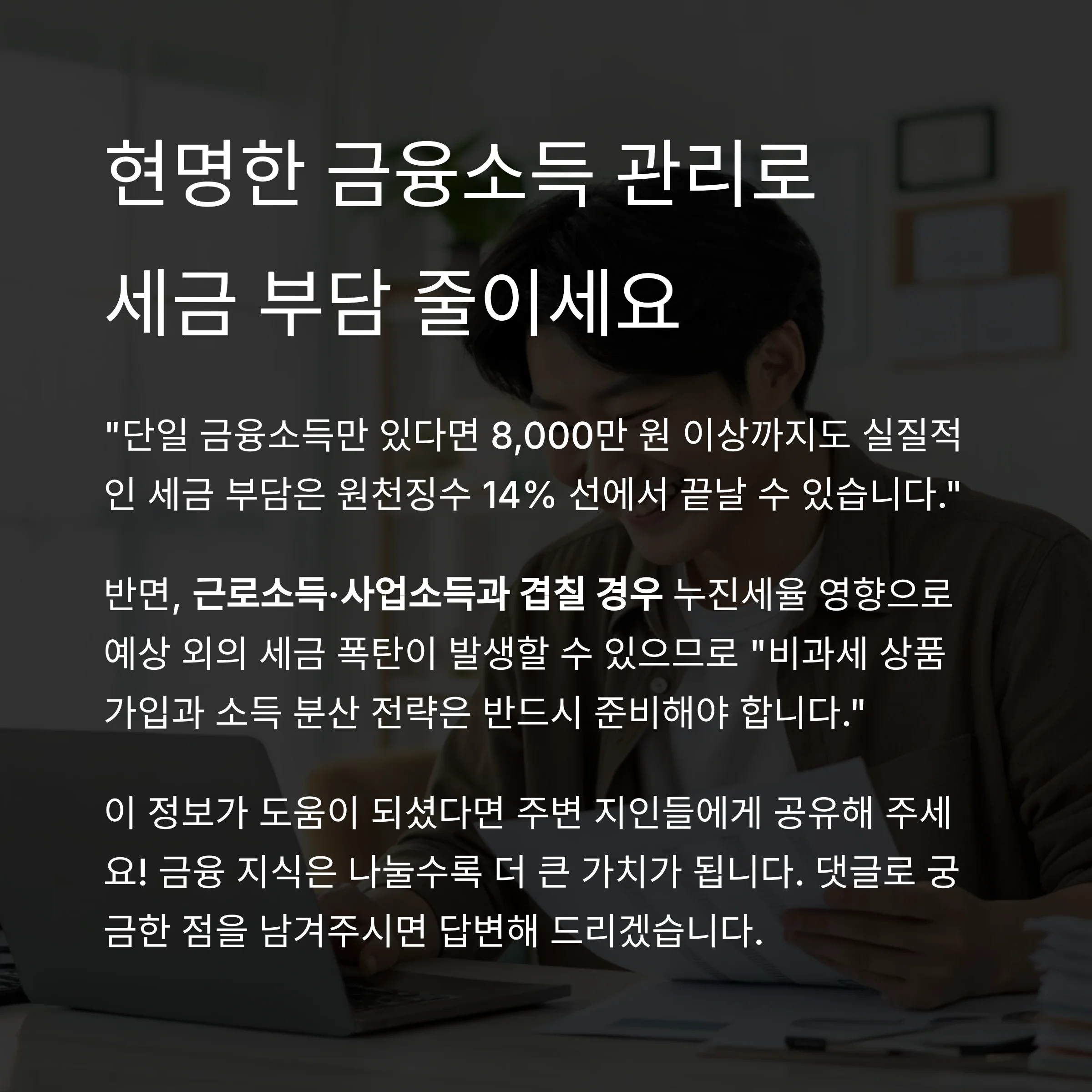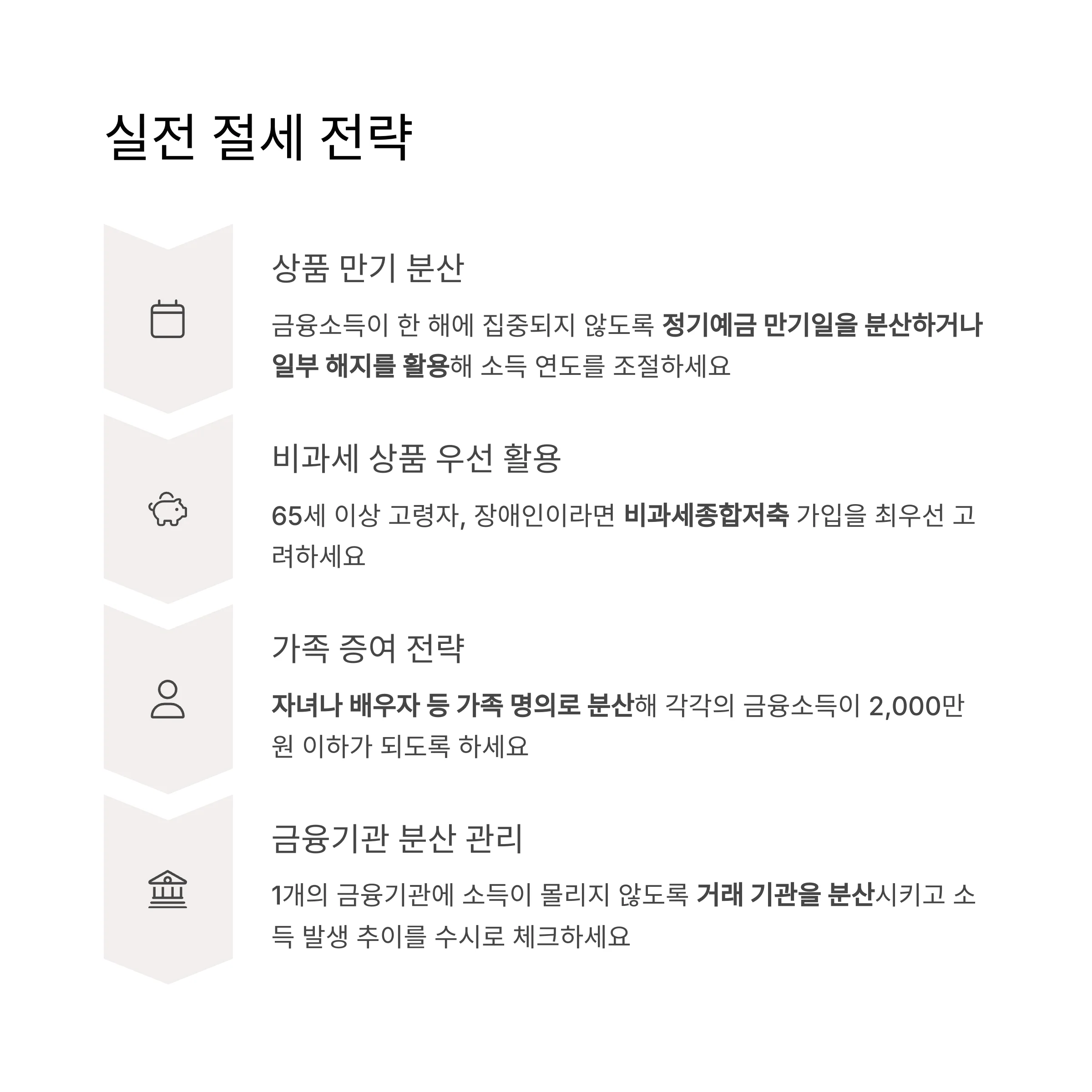 "비과세 상품 가입과 소득 분산 전략은 반드시 준비해야 합니다."