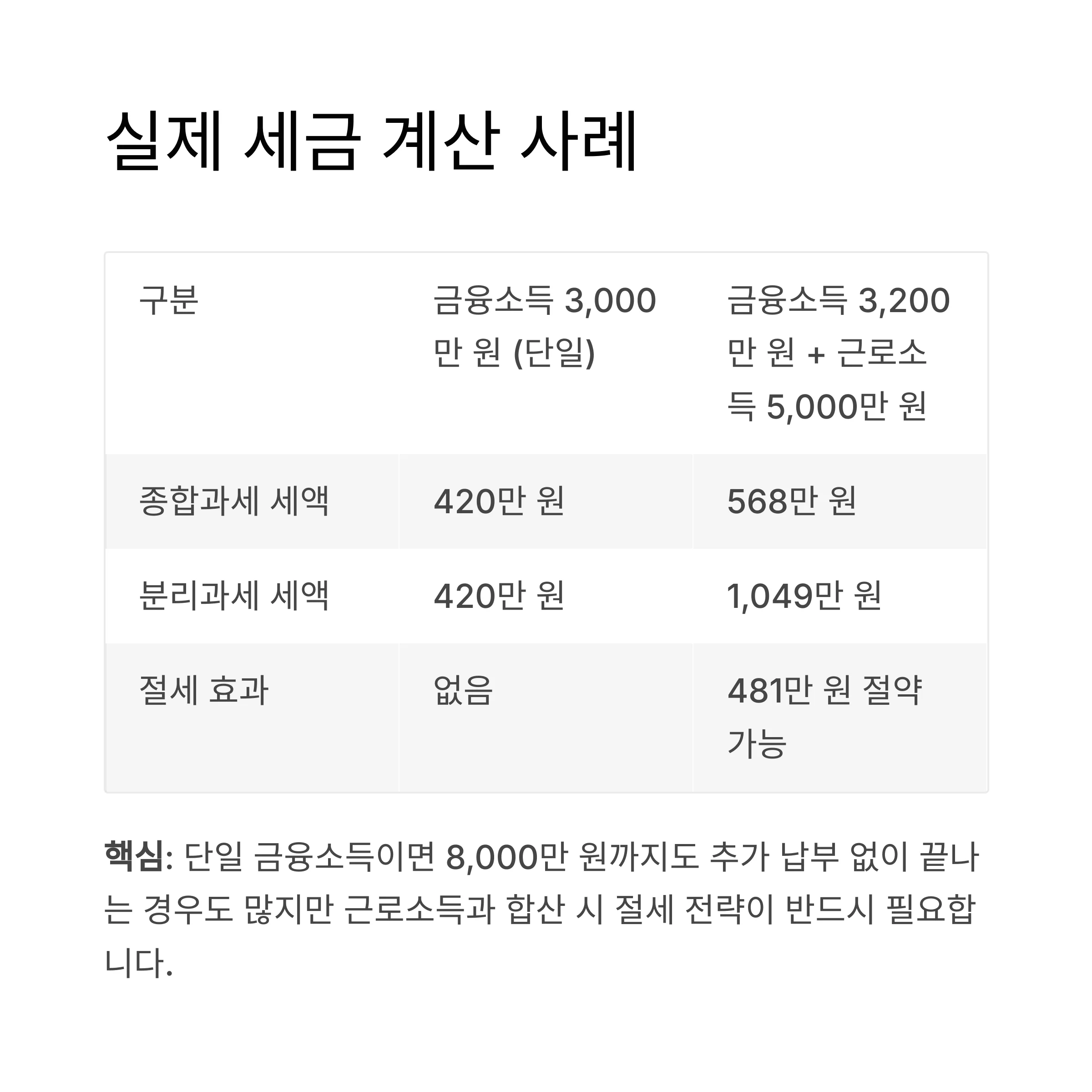 핵심: 단일 금융소득이면 8,000만 원까지도 추가 납부 없이 끝나는 경우도 많지만