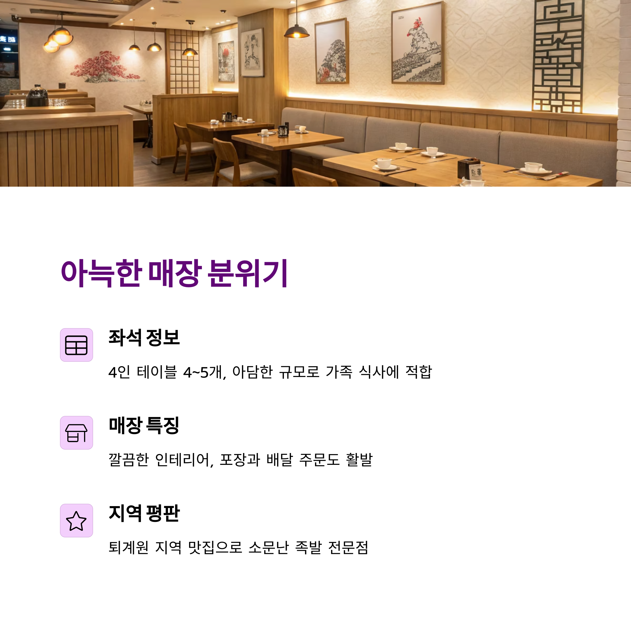 비록 구체적인 메뉴 가격은 텍스트에서 확인되지 않으나, 족발 전문점이니만큼 품질 좋은 주 메뉴가 기다리고 있을 것으로 보입니다.