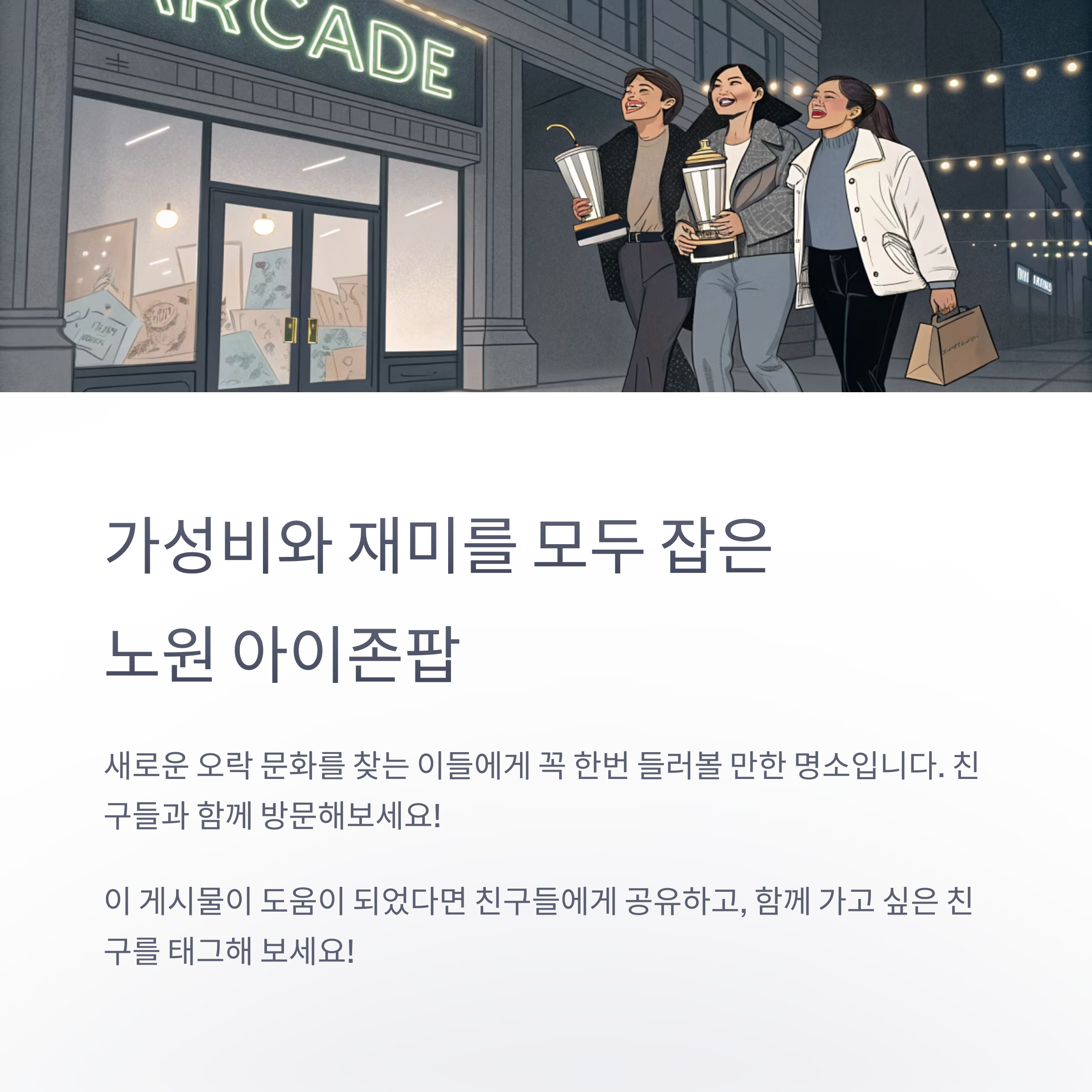노원 아이존팝은 ‘가성비와 재미’를 모두 만족시키는 시간제 오락실로, 새로운 오락 문화를 찾는 이들에게 꼭 한번 들러볼 만한 명소입니다.