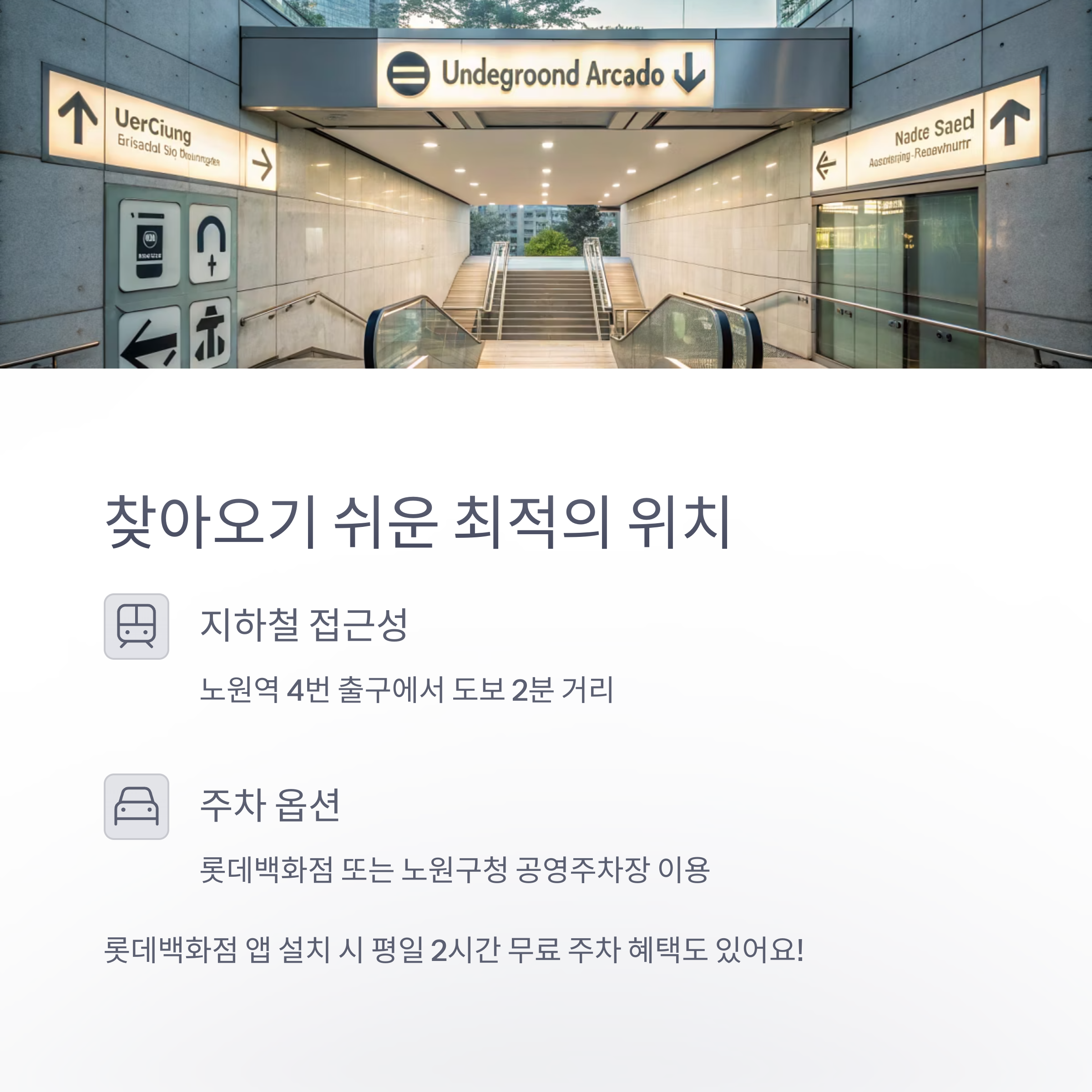 전용 주차장은 없지만, 인근 롯데백화점 또는 노원구청 공영주차장을 이용하면 편리하며