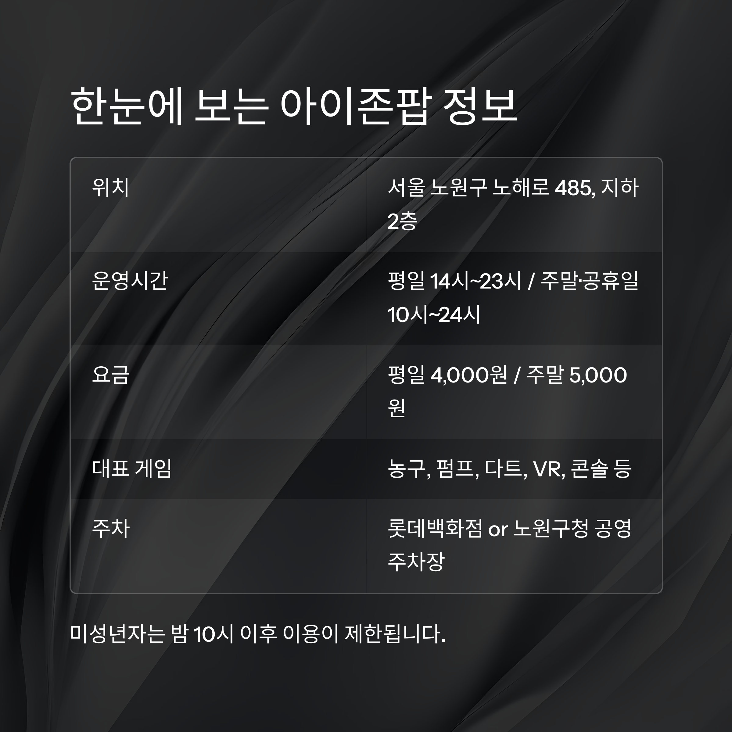 노원 아이존팝은 ‘가성비와 재미’를 모두 만족시키는 시간제 오락실로, 새로운 오락 문화를 찾는 이들에게 꼭 한번 들러볼 만한 명소입니다.