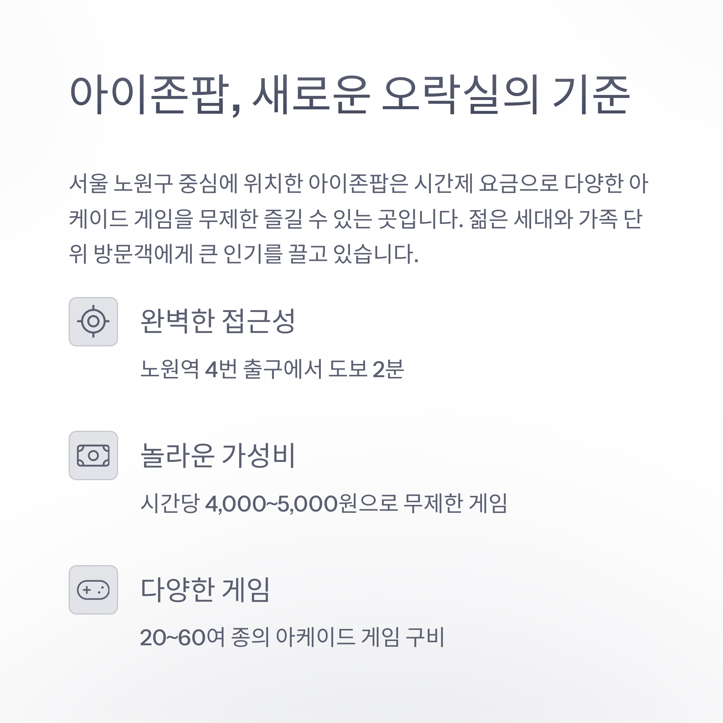 서울 노원구 중심에 위치한 아이존팝은 시간제 요금제로 다양한 아케이드 게임을 무제한으로 즐길 수 있는 신개념 오락실입니다.