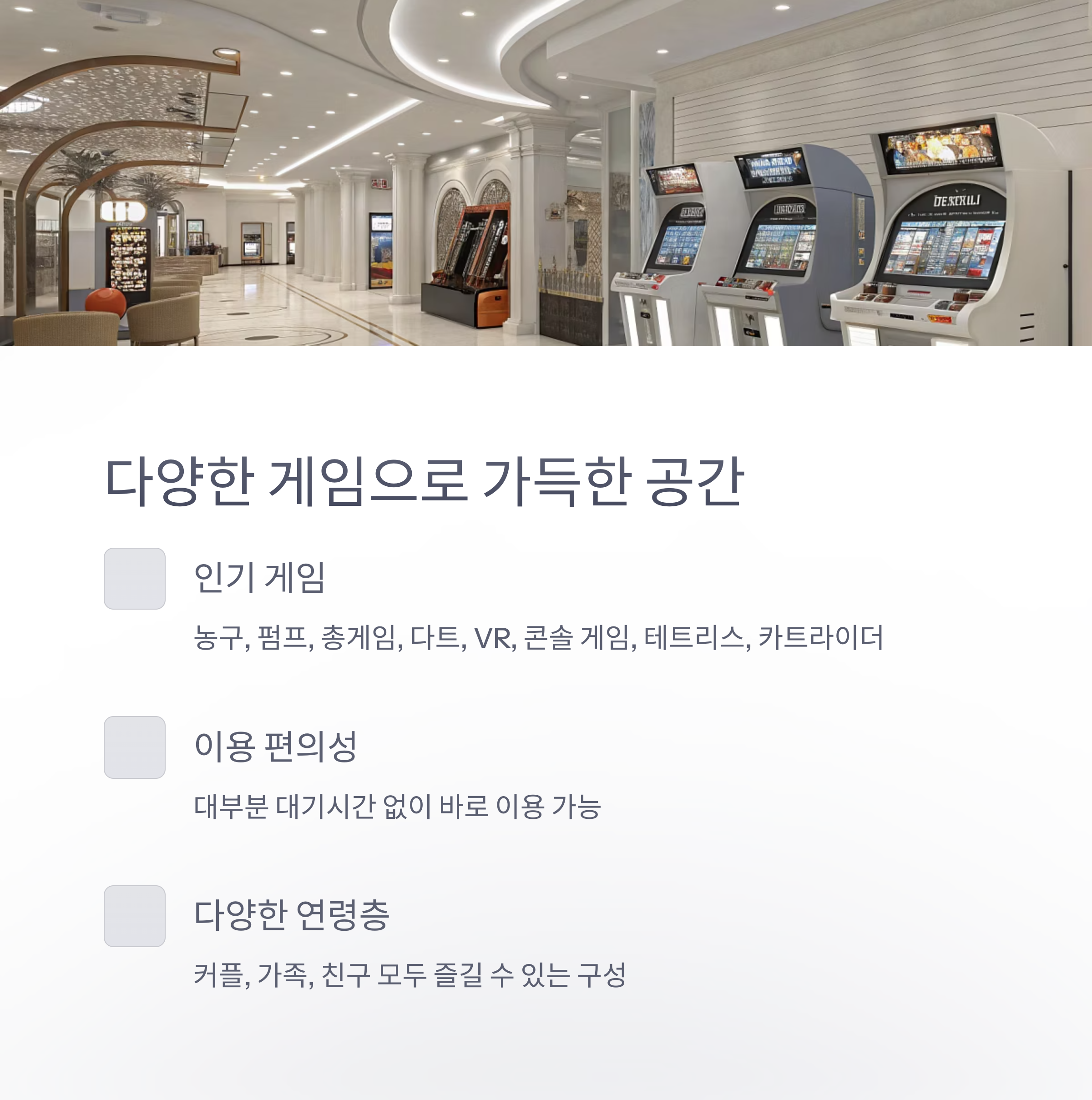 대표 게임으로는 농구, 펌프, 총게임, 다트, VR, 콘솔 게임, 테트리스, 카트라이더 등이 있으며