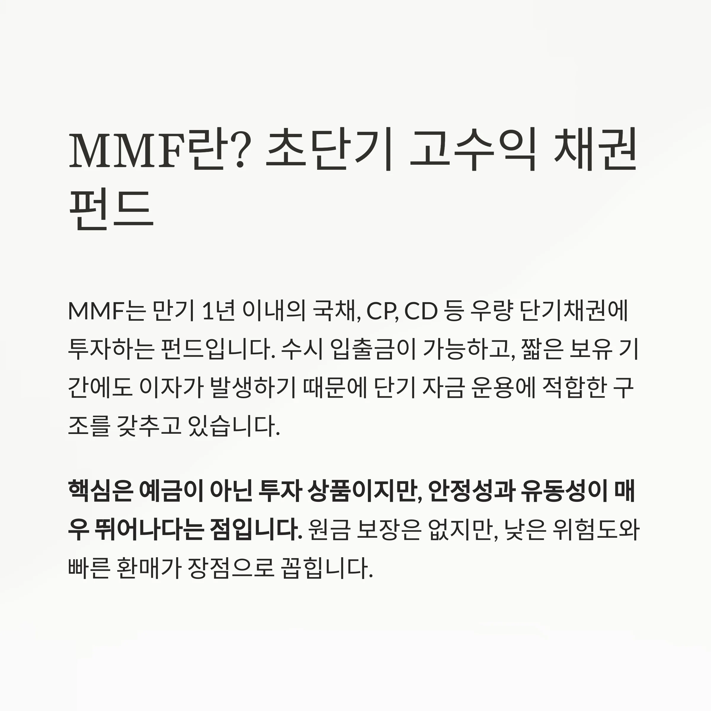 MMF는 만기 1년 이내의 국채, CP, CD 등 우량 단기채권에 투자하는 펀드입니다.