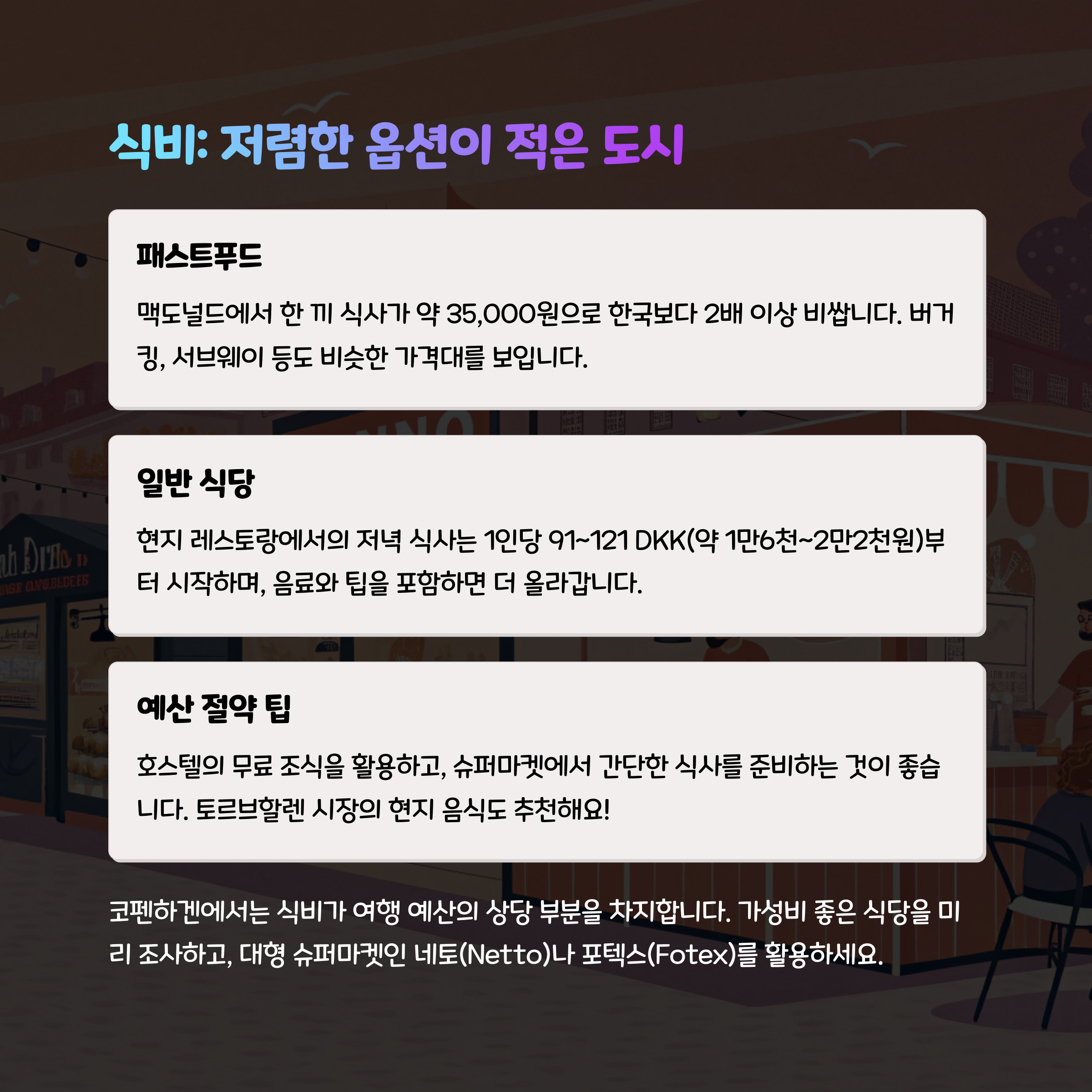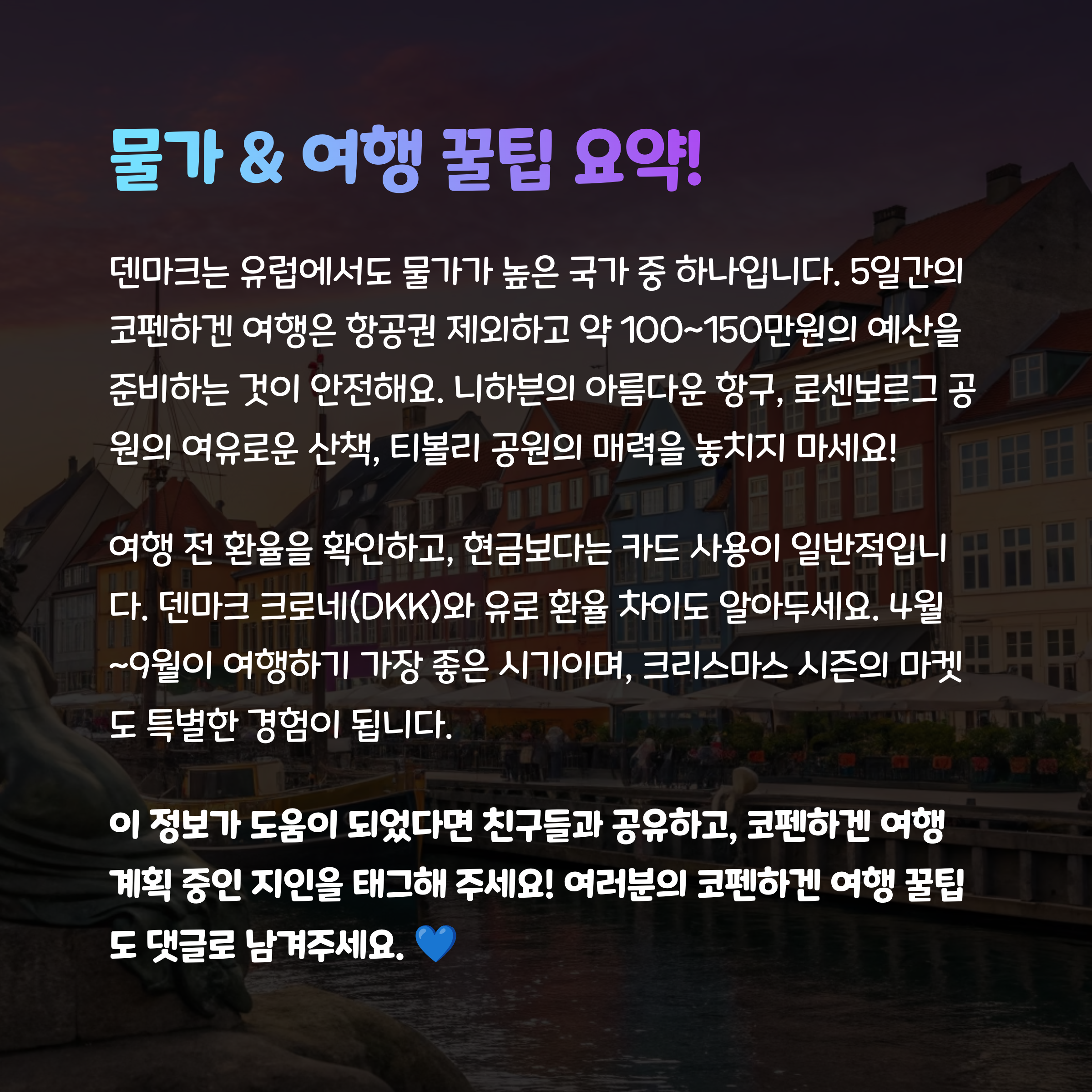고물가 지역이라는 점을 인식하고, 사전 준비와 전략적인 소비가 덴마크 여행의 성공 포인트가 될 것입니다.