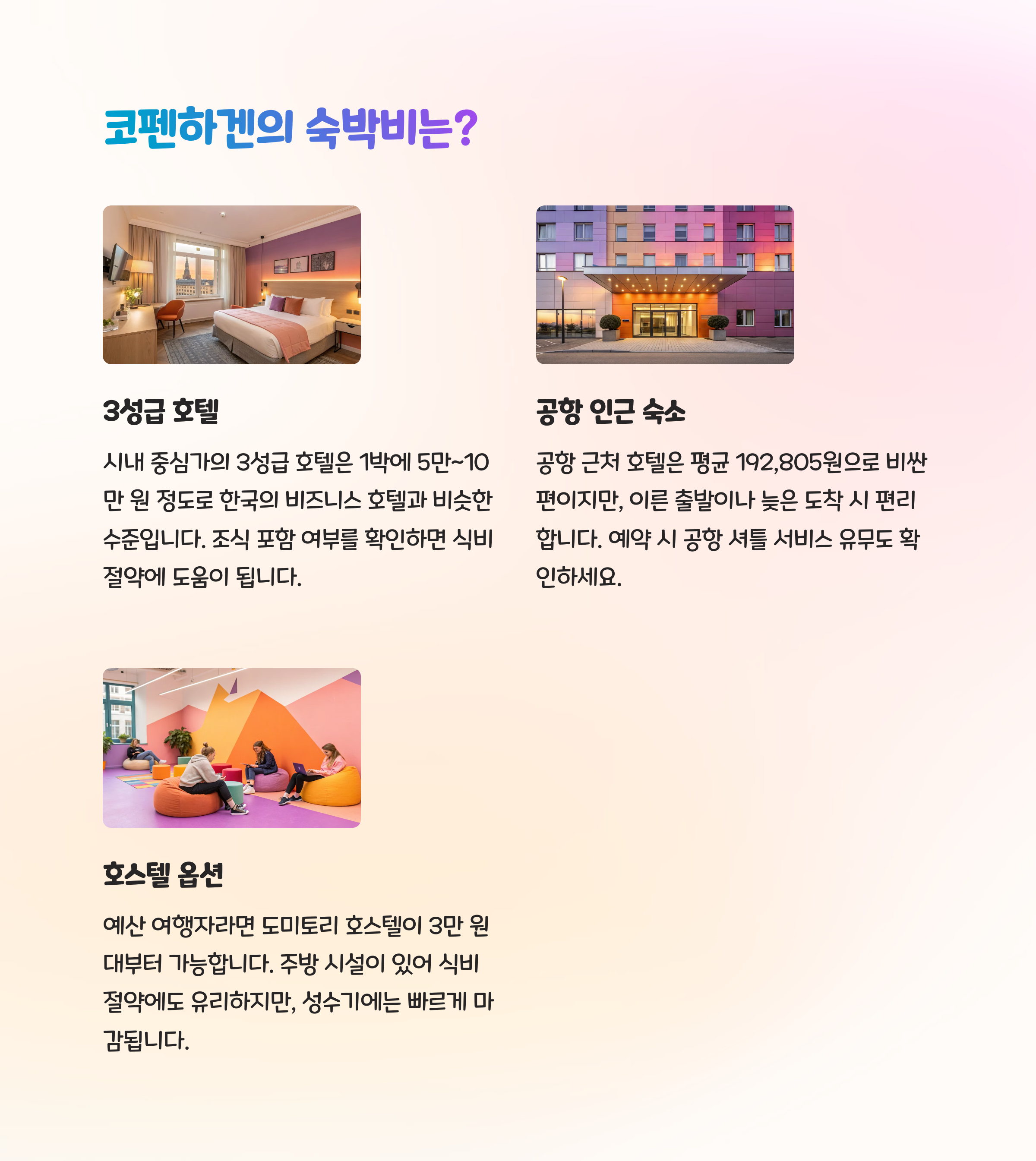 특히 코펜하겐은 다른 덴마크 도시들보다 숙박비와 생활비 측면에서 더 높습니다.