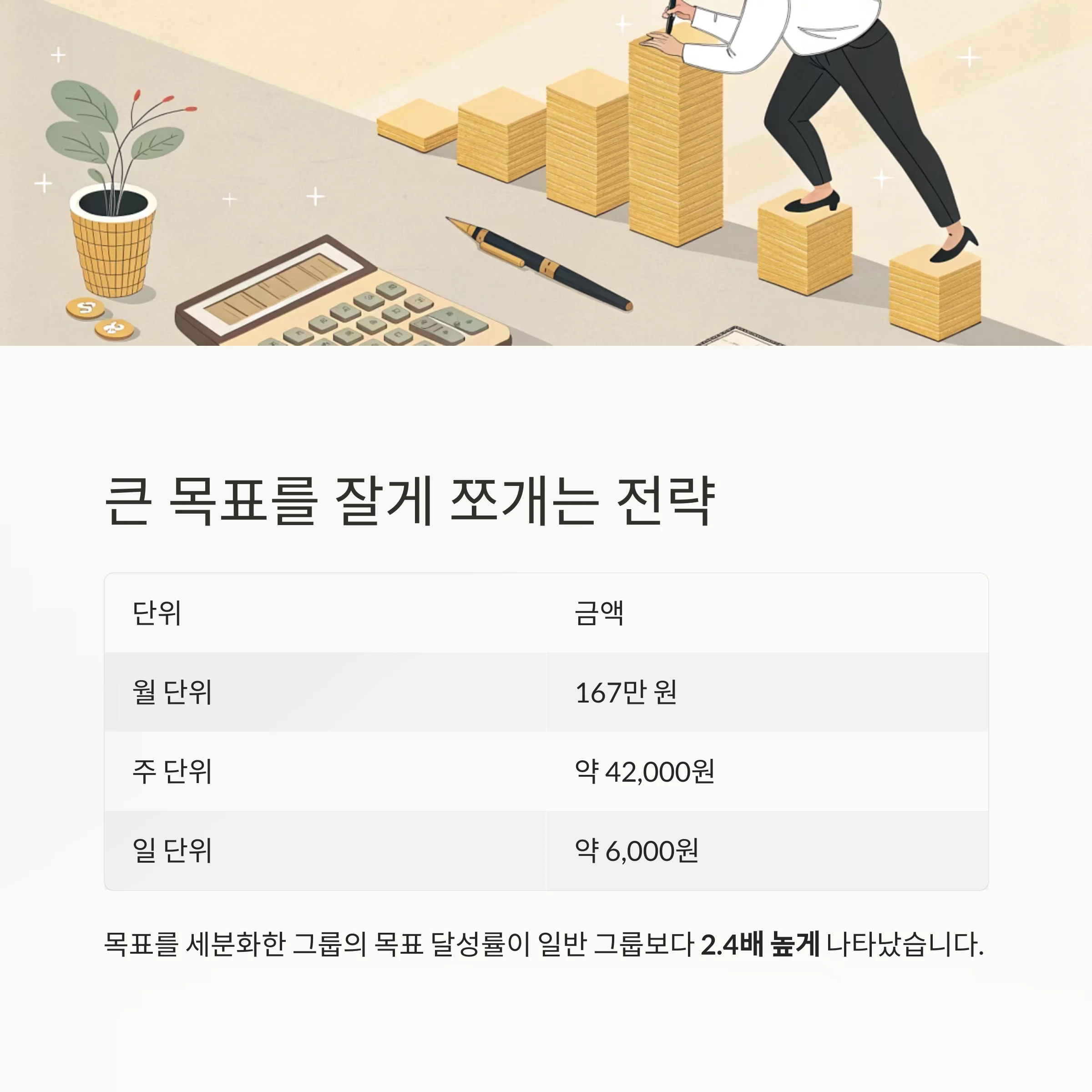 목표를 세분화한 그룹의 목표 달성률이 일반 그룹보다 2.4배 높게 나타났습니다.