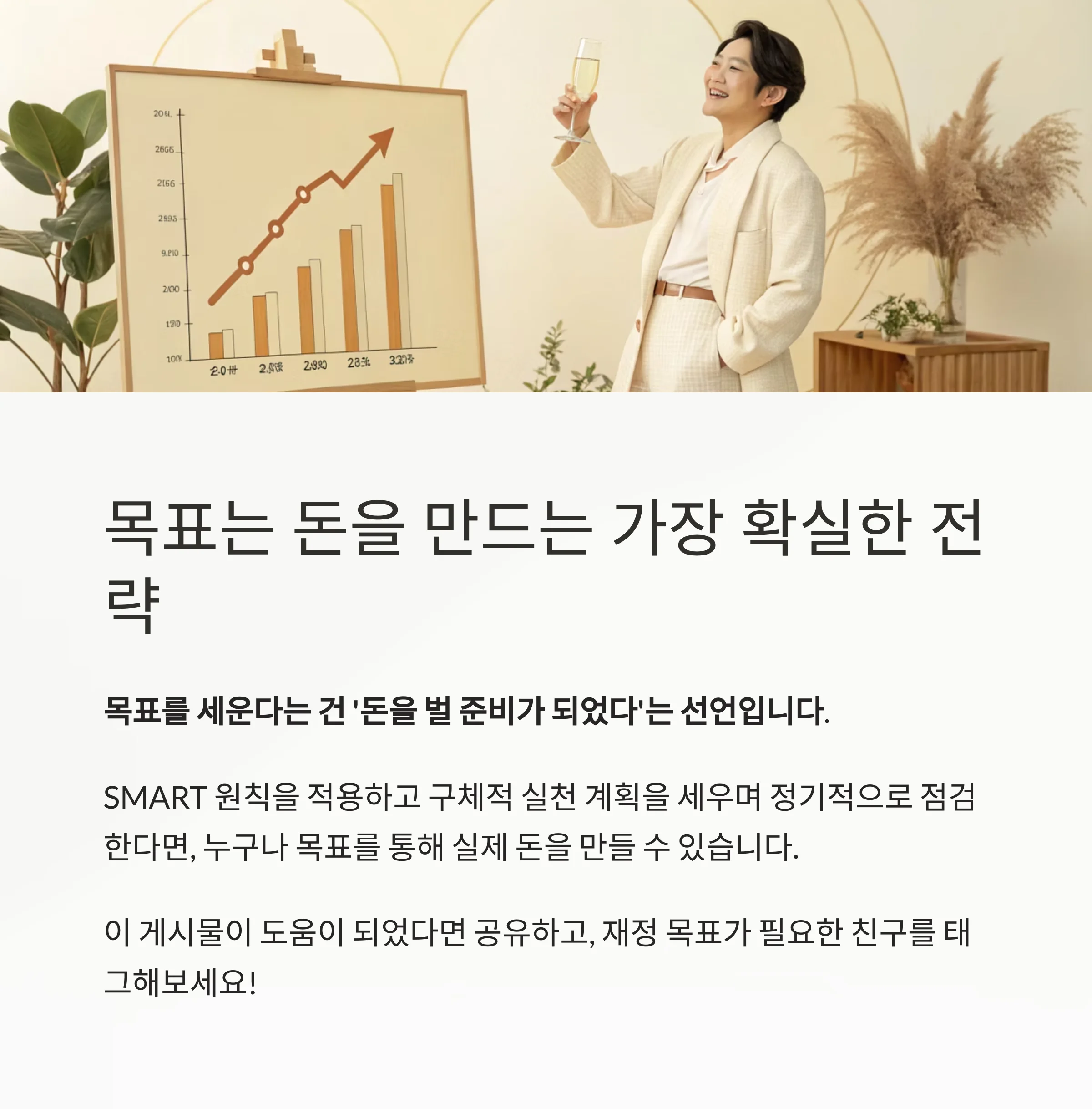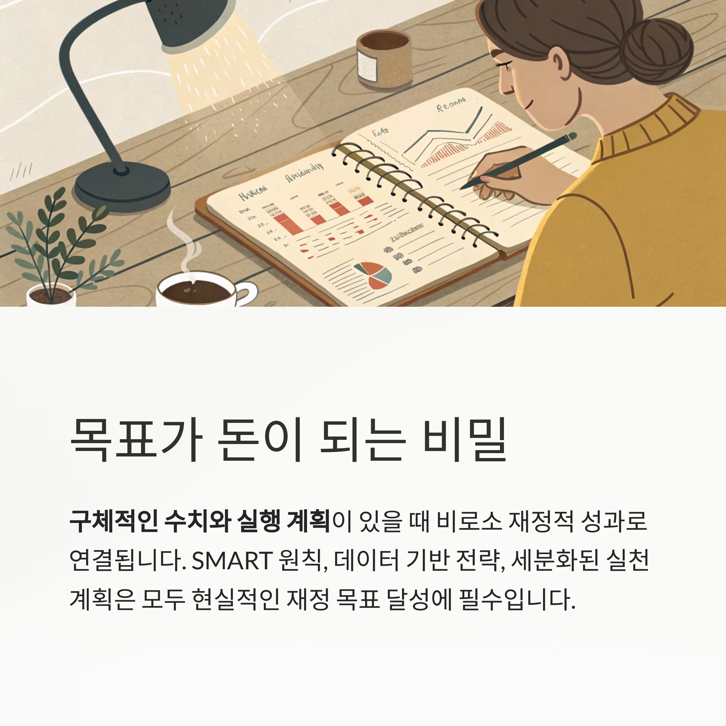 목표는 단순한 희망 사항이 아닙니다. 구체적인 수치와 실행 계획을 수반할 때 비로소 재정적 성과로 연결됩니다.