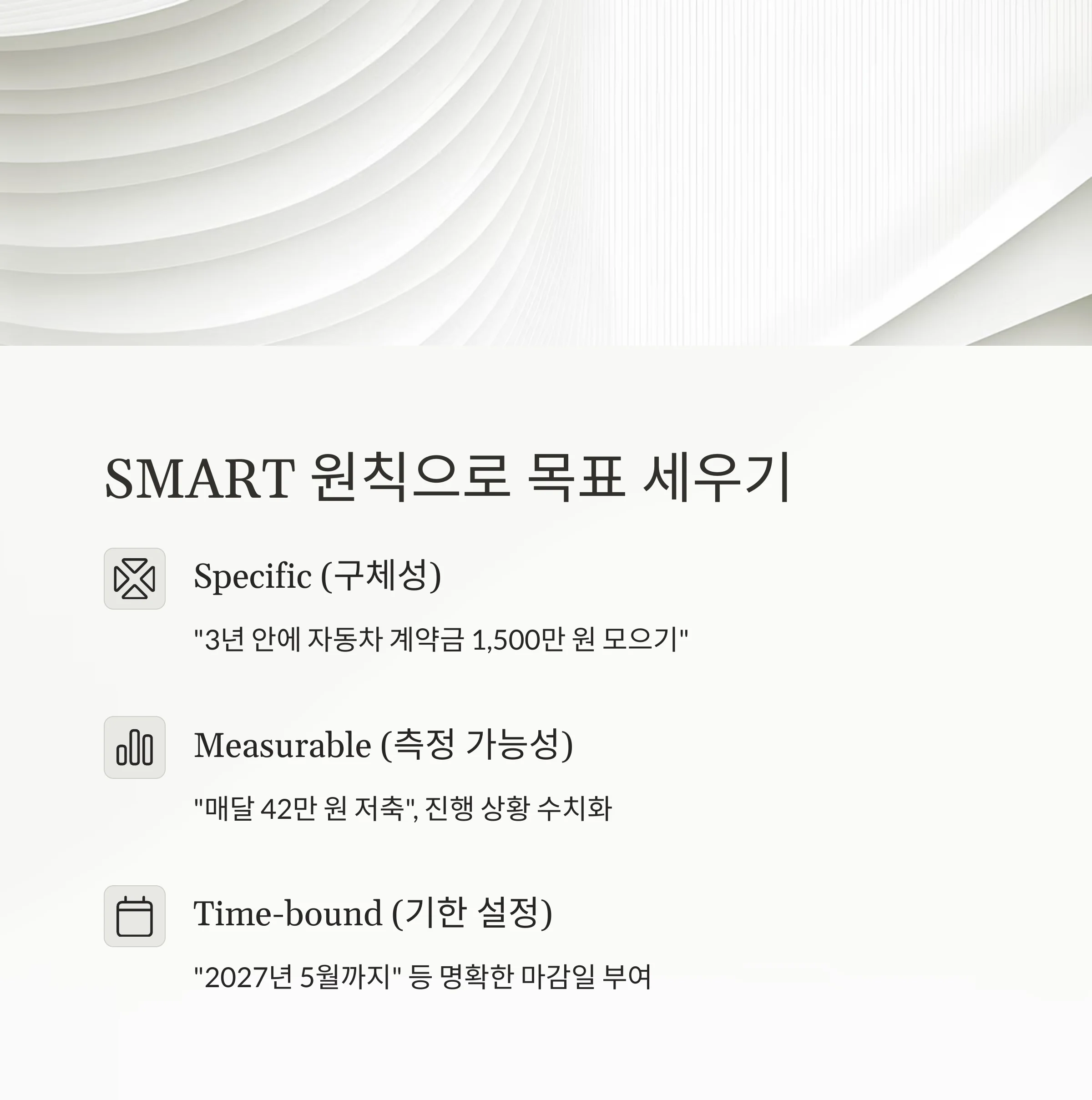 Specific (구체성) | "3년 안에 자동차 계약금 1,500만 원 모으기" |