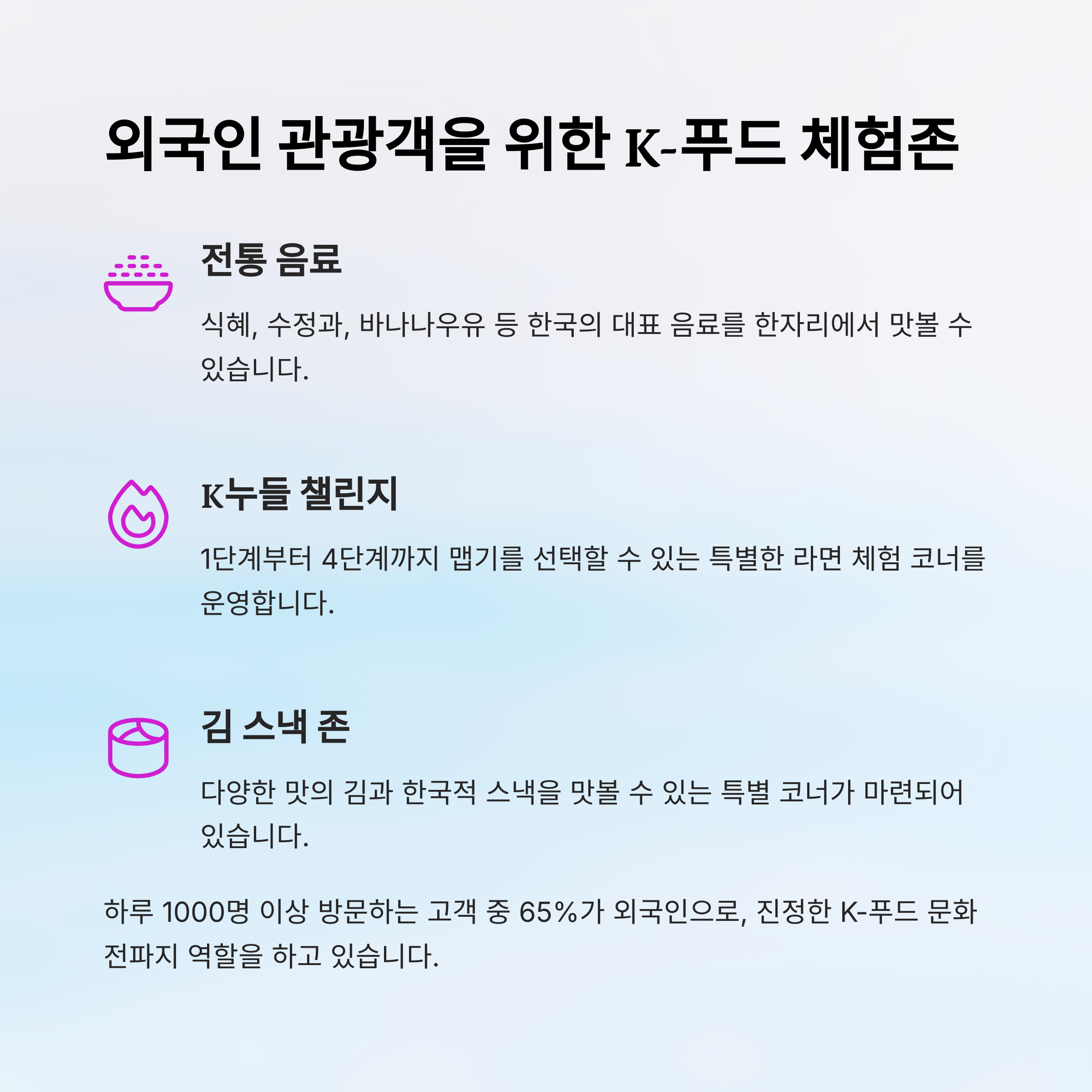 K푸드와 리테일테크의 결합은 외국 방문객들에게 크게 어필하며, 방문자의 65%가 외국인입니다.