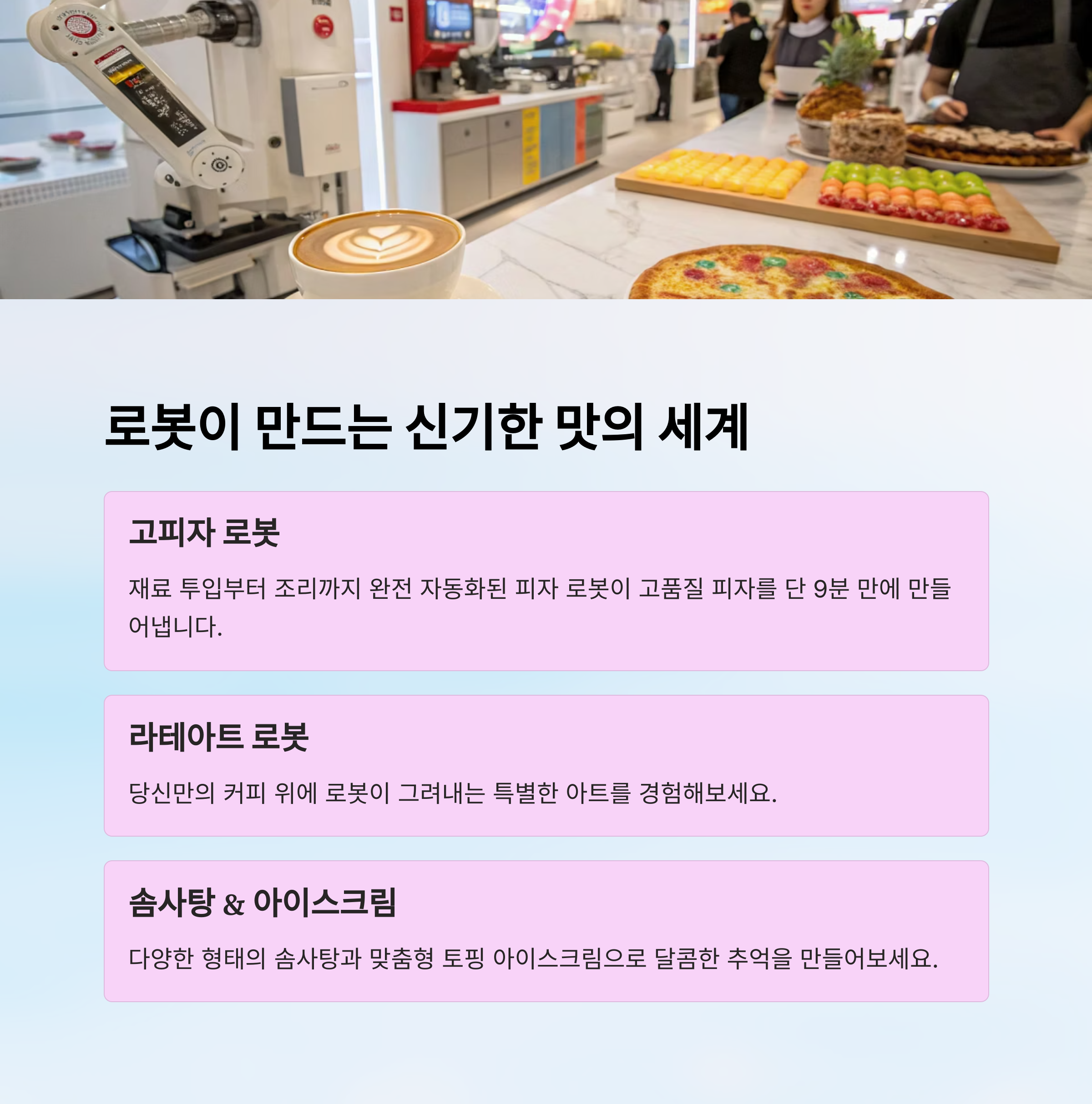 매장에서는 푸드테크 로봇을 활용한 신개념 음식 제작 및 디스플레이를 직접 체험할 수 있습니다.