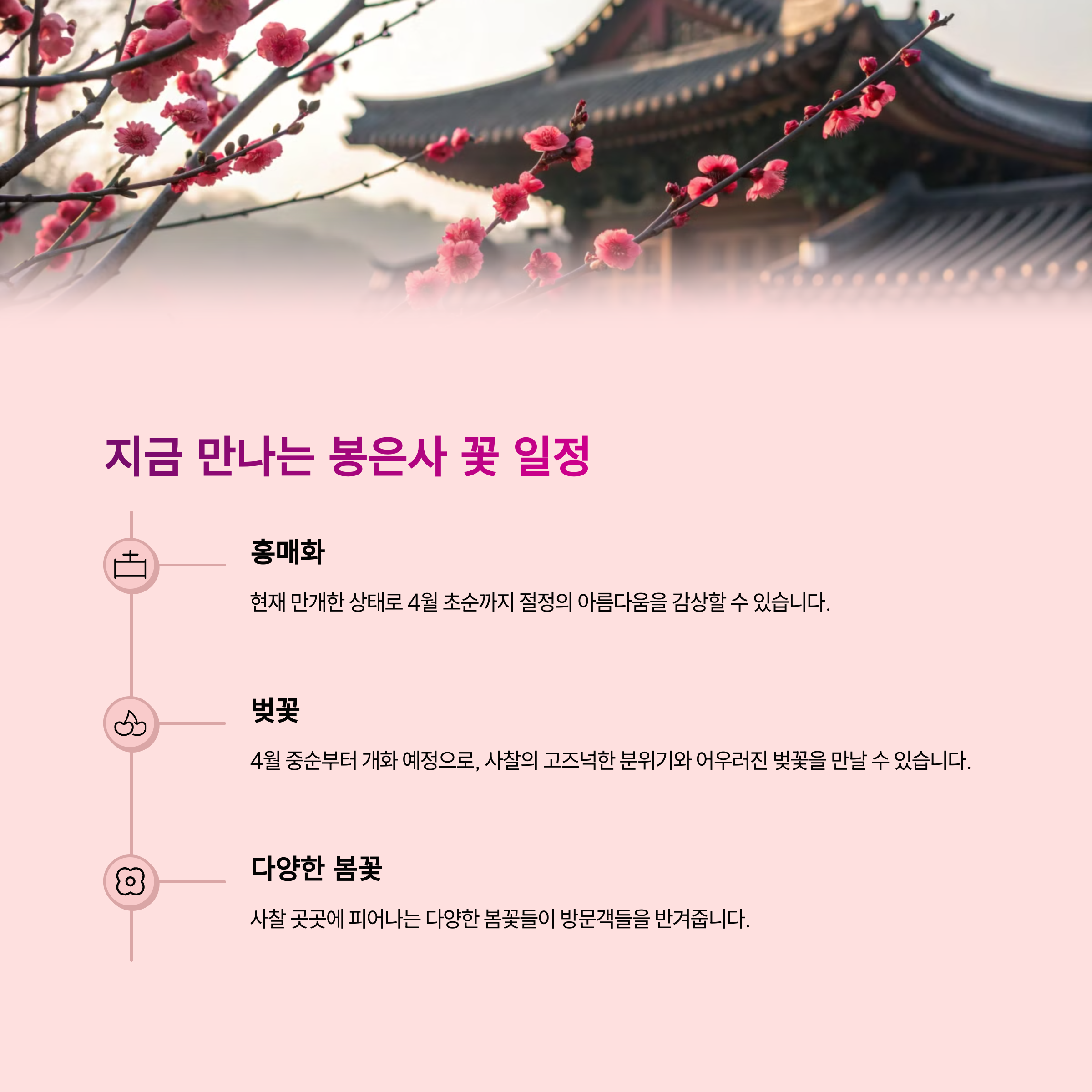 이번 주말, 홍매화의 만개한 아름다움을 봉은사에서 꼭 확인해 보세요.