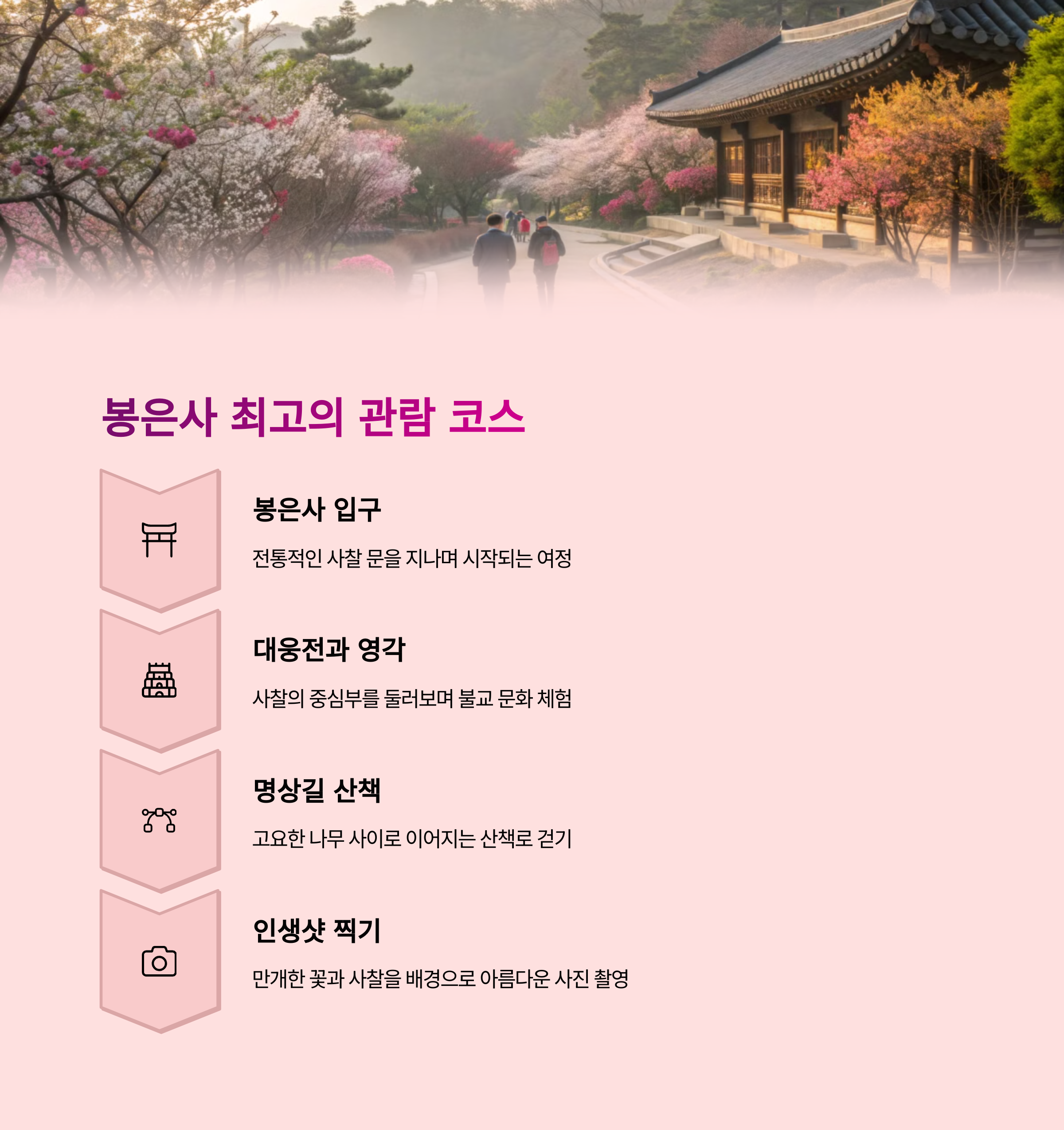 | 봉은사 꽃 관람은 오전 10시에서 오후 4시 사이가 적합합니다. 홍매화가 만개해 있는 이 시기에는 오전 시간대 방문이 추천됩니다. 대웅전 주변 목련 감상은 상대적으로 조용한 점심 시간을 추천합니다. 벚꽃 개화는 4월 초 이후 예정으로, 주말 오전 방문을 계획해보세요. 명상길 산책은 오후 시간에 여유롭게 진행할 수 있습니다. |