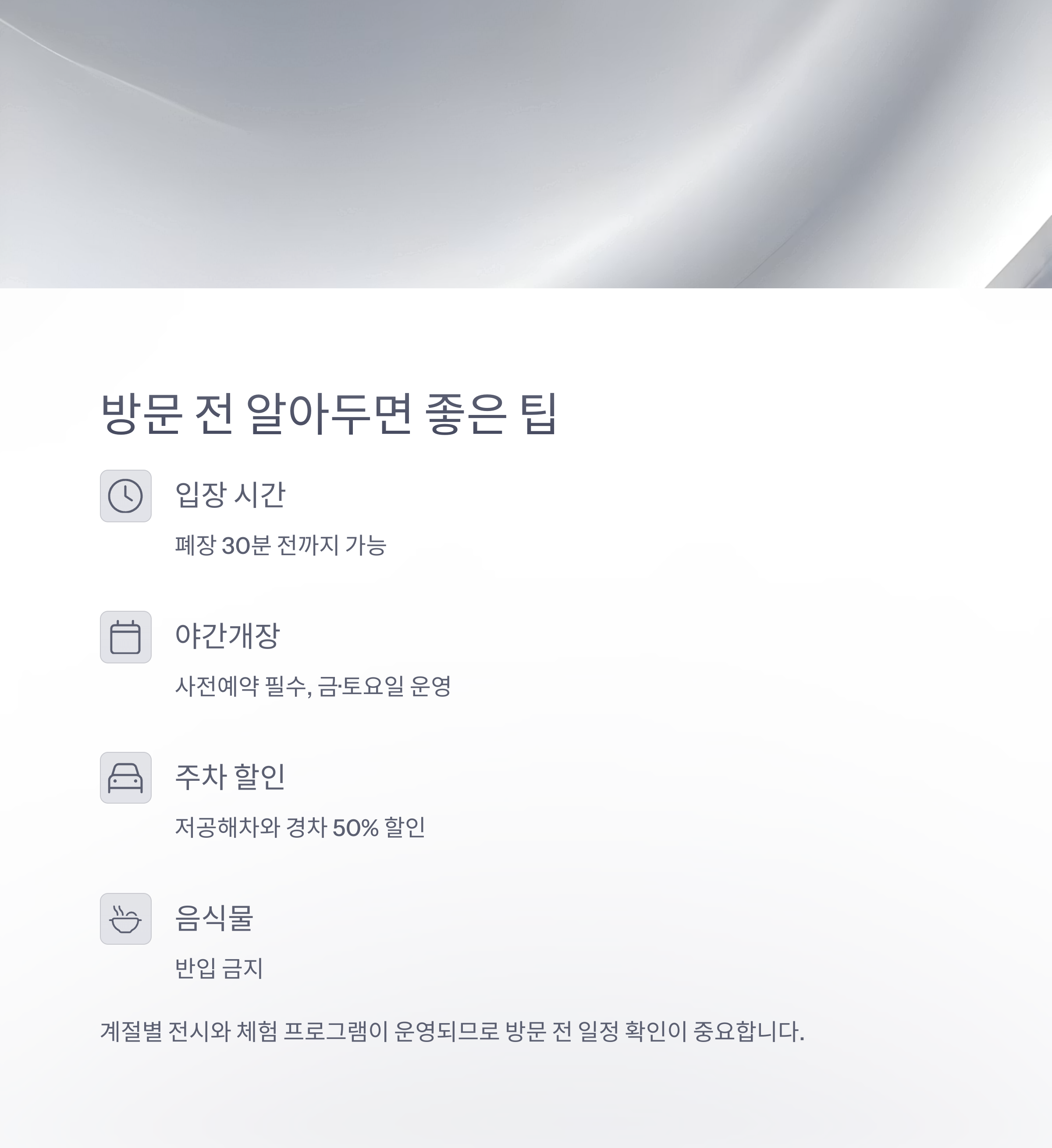 또한 계절별 전시와 체험 프로그램이 운영되므로 방문 전 일정 확인이 중요합니다.