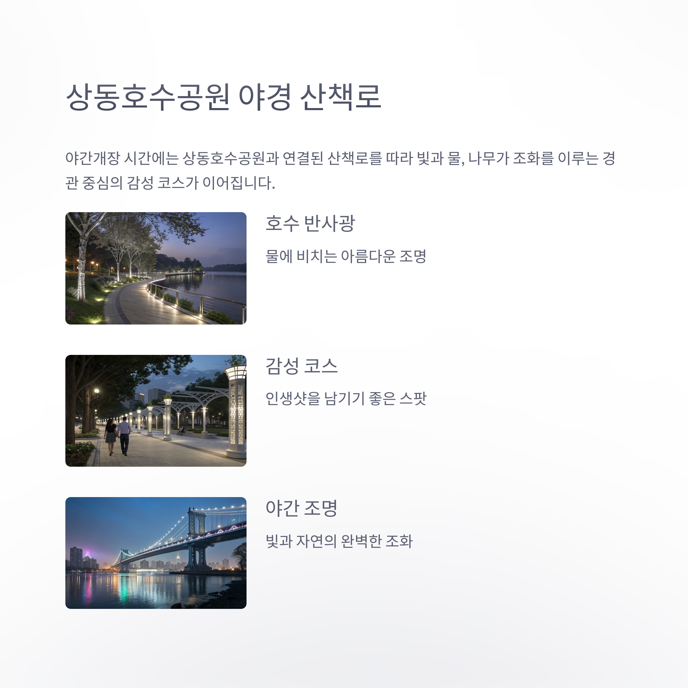 빛과 물, 나무가 조화를 이루는 경관 중심의 감성 코스가 이어집니다.