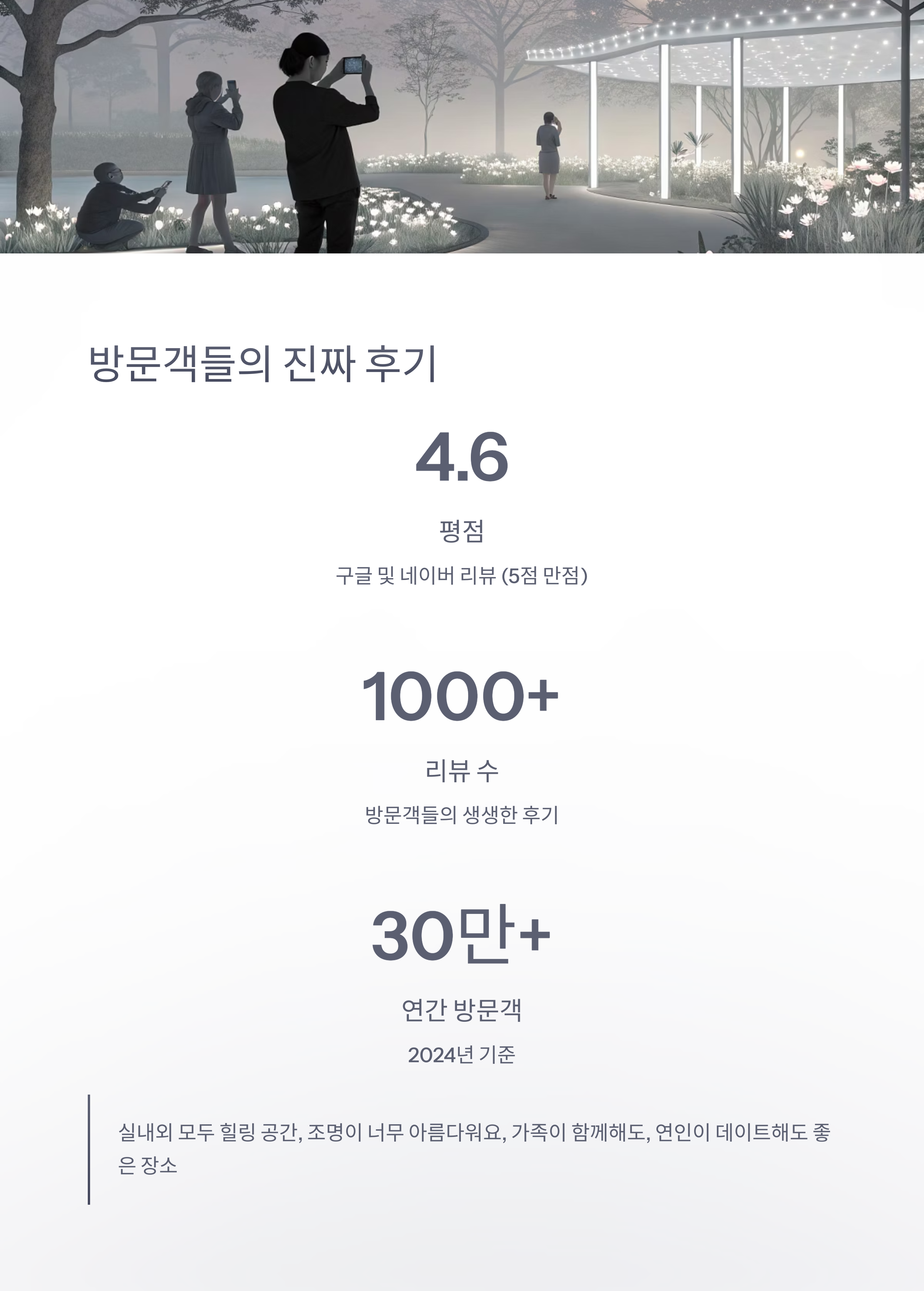 "실내외 모두 힐링 공간", "조명이 너무 아름다워요",