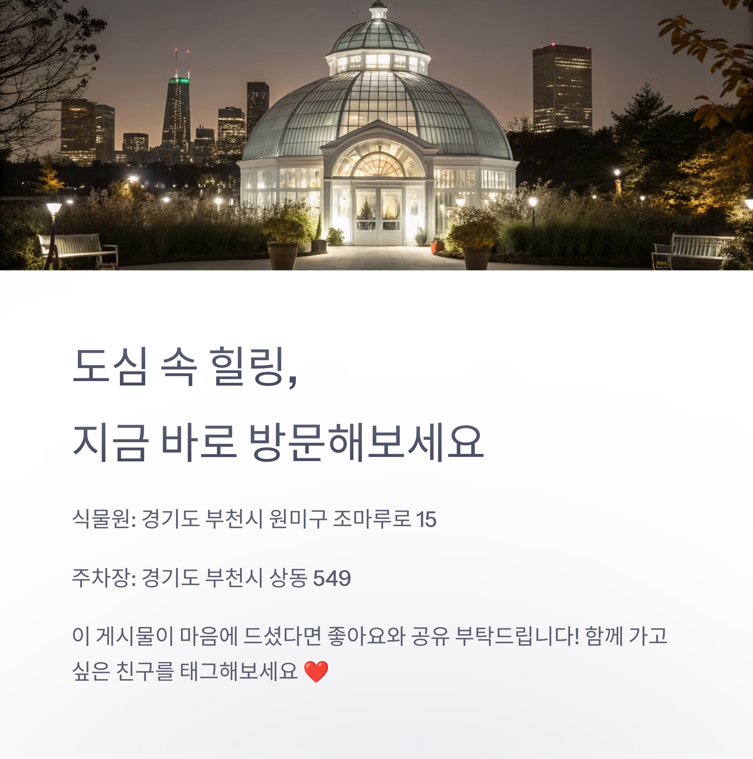 경기도 부천의 대표적인 복합 자연문화 공간인 수피아 식물원과 상동호수공원 야경 코스는