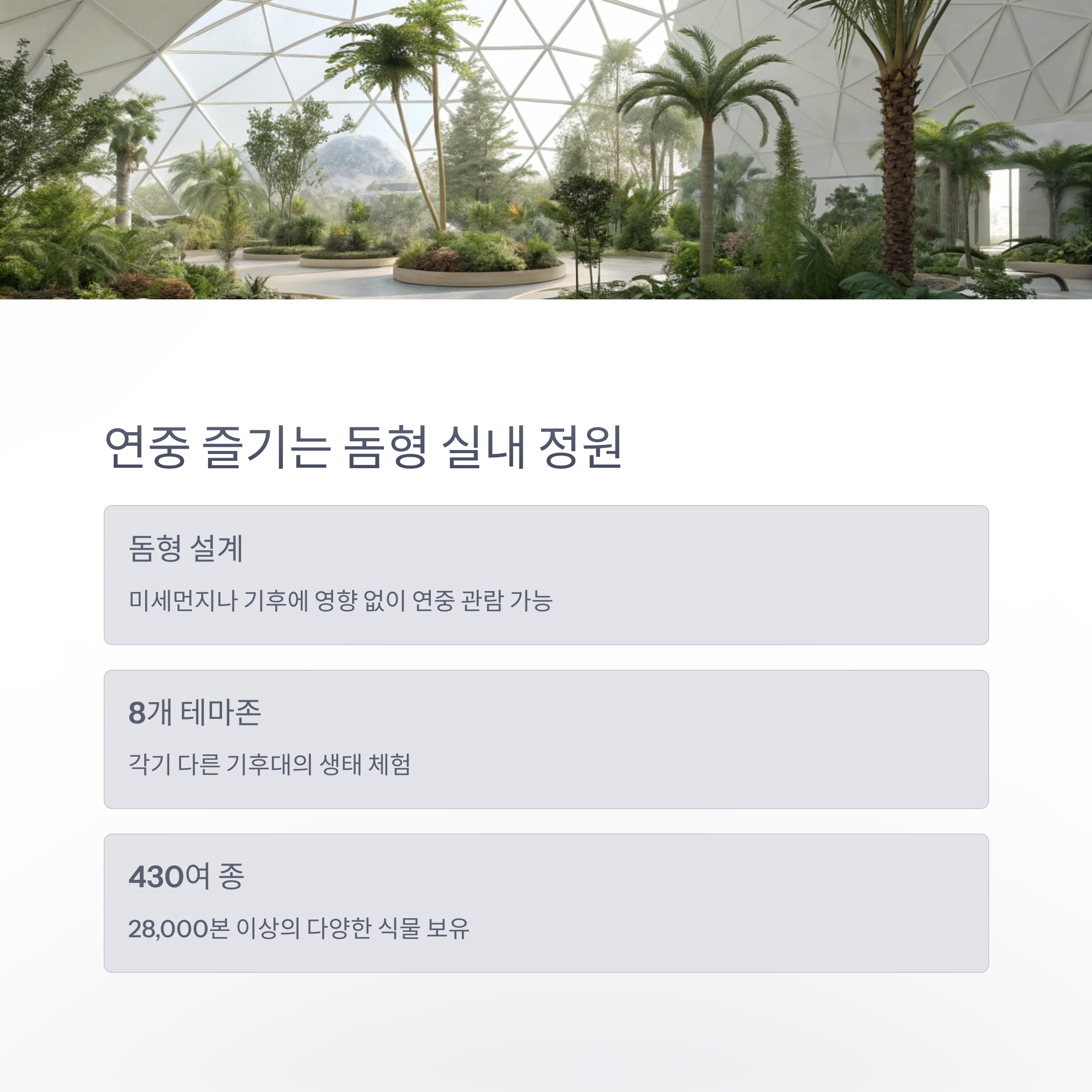 미세먼지나 기후에 영향을 받지 않고 다양한 식물을 감상할 수 있습니다.