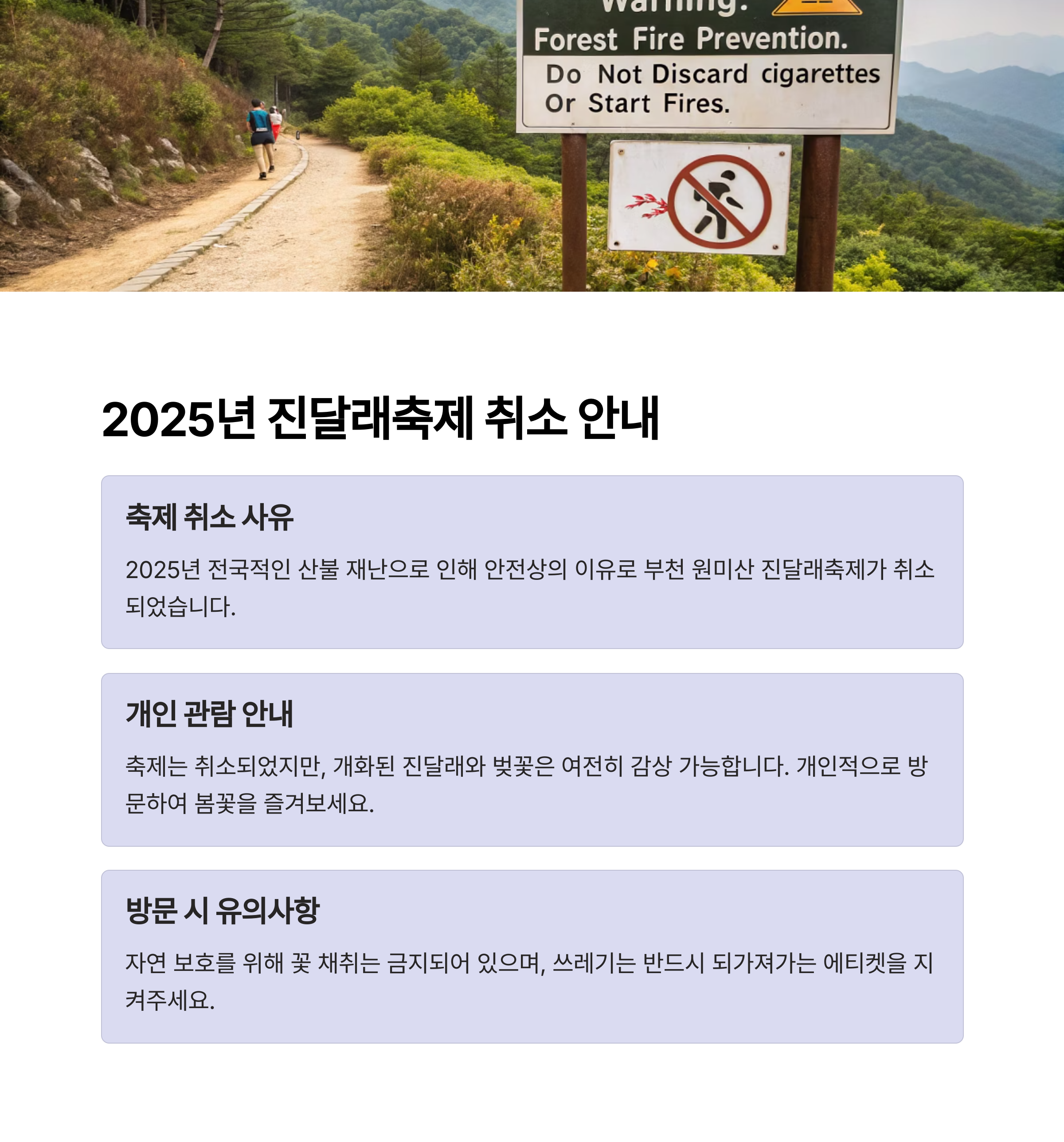 2025년에는 전국 산불로 인한 축제 취소로 조용히 꽃을 즐기려는 방문객들로 더욱 주목받고 있습니다.