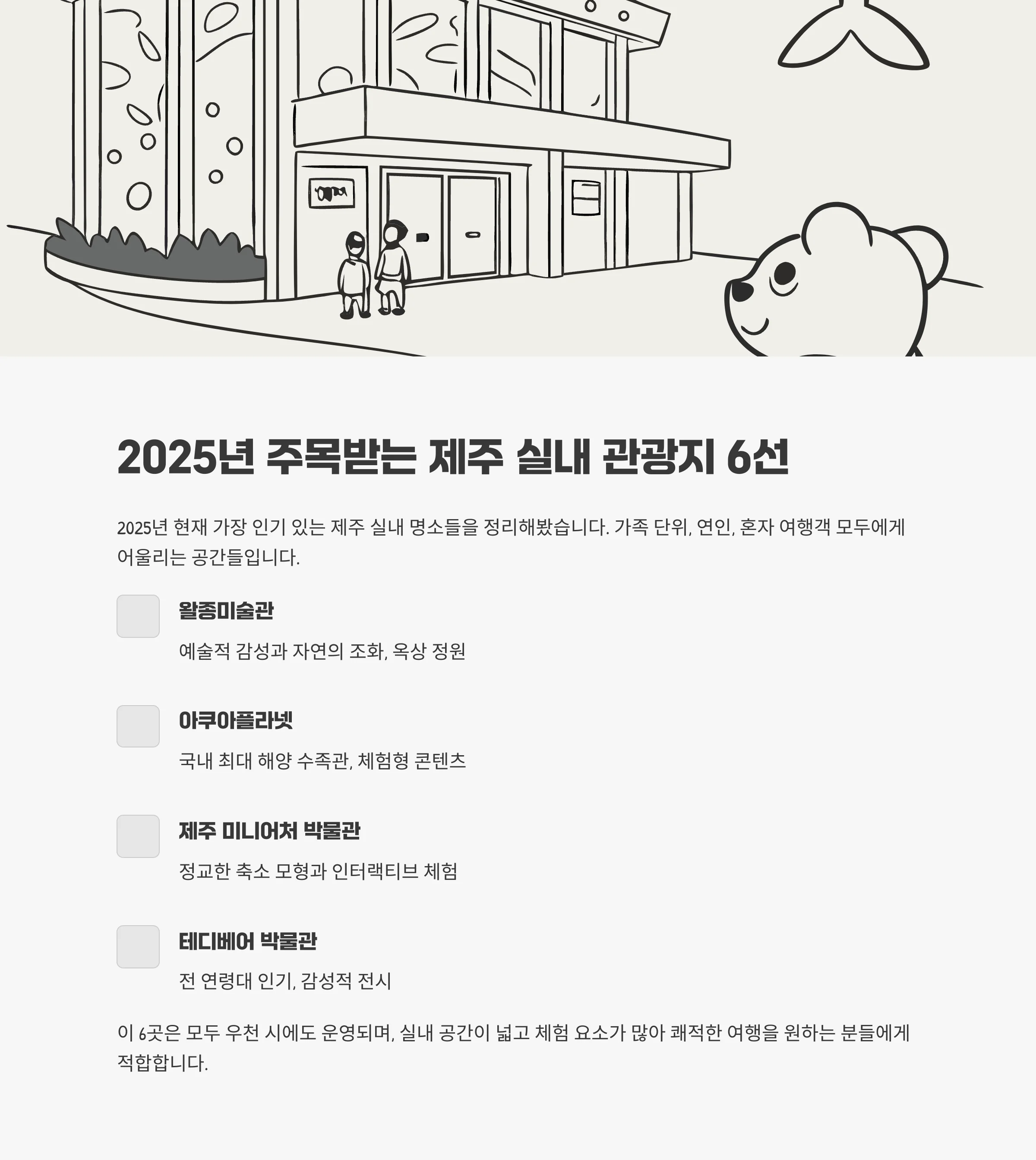 2025년 현재 가장 인기 있는 제주 실내 명소들을 정리해봤습니다.