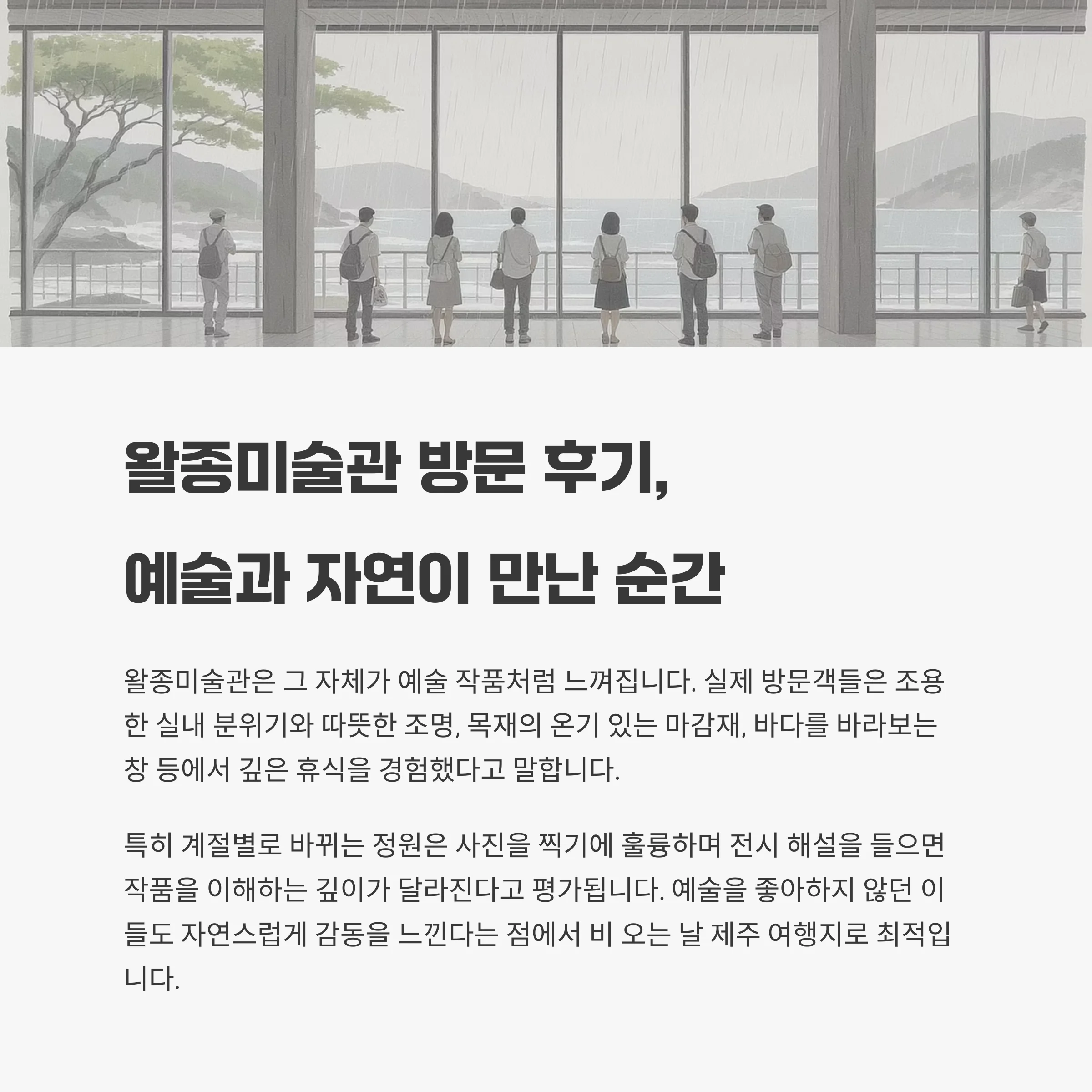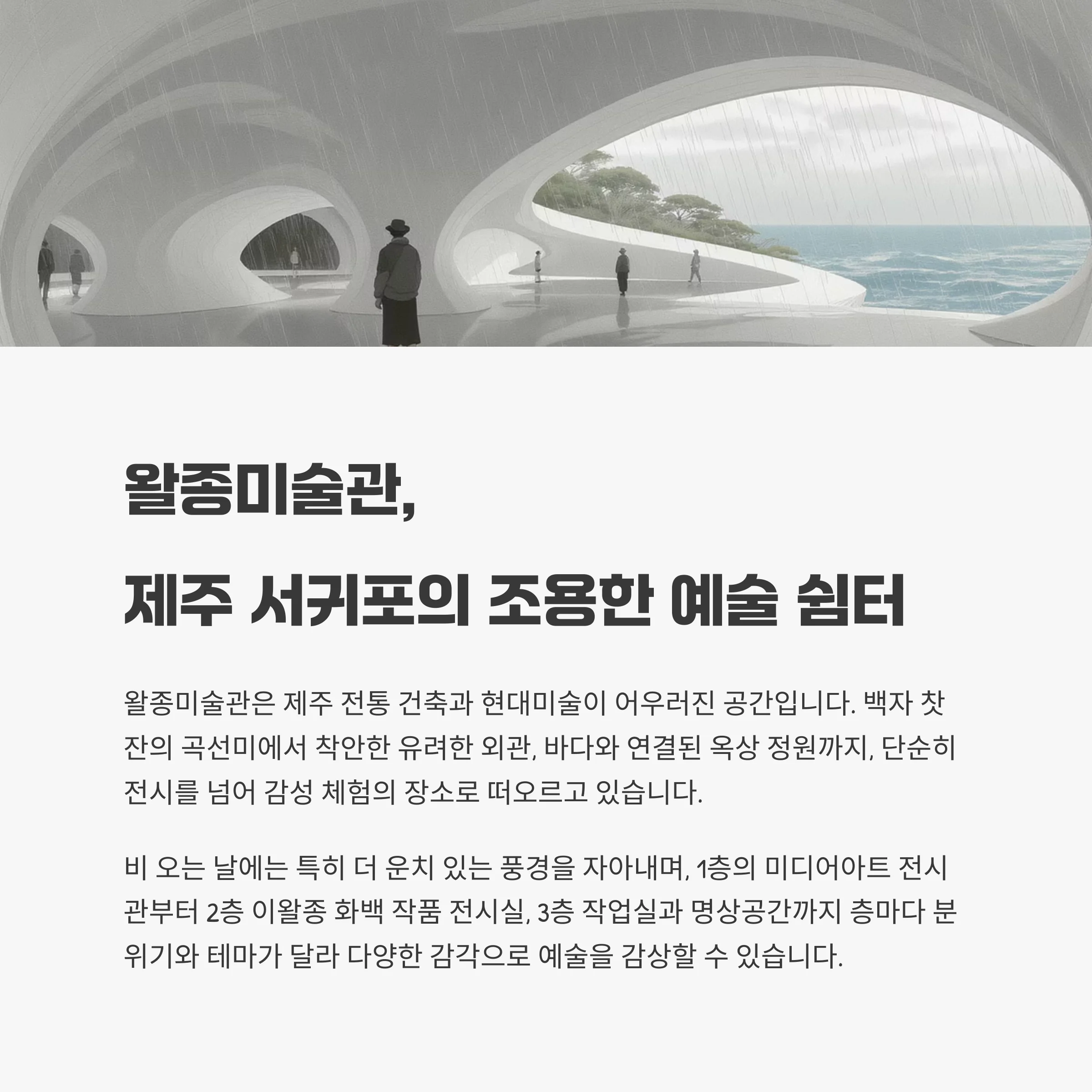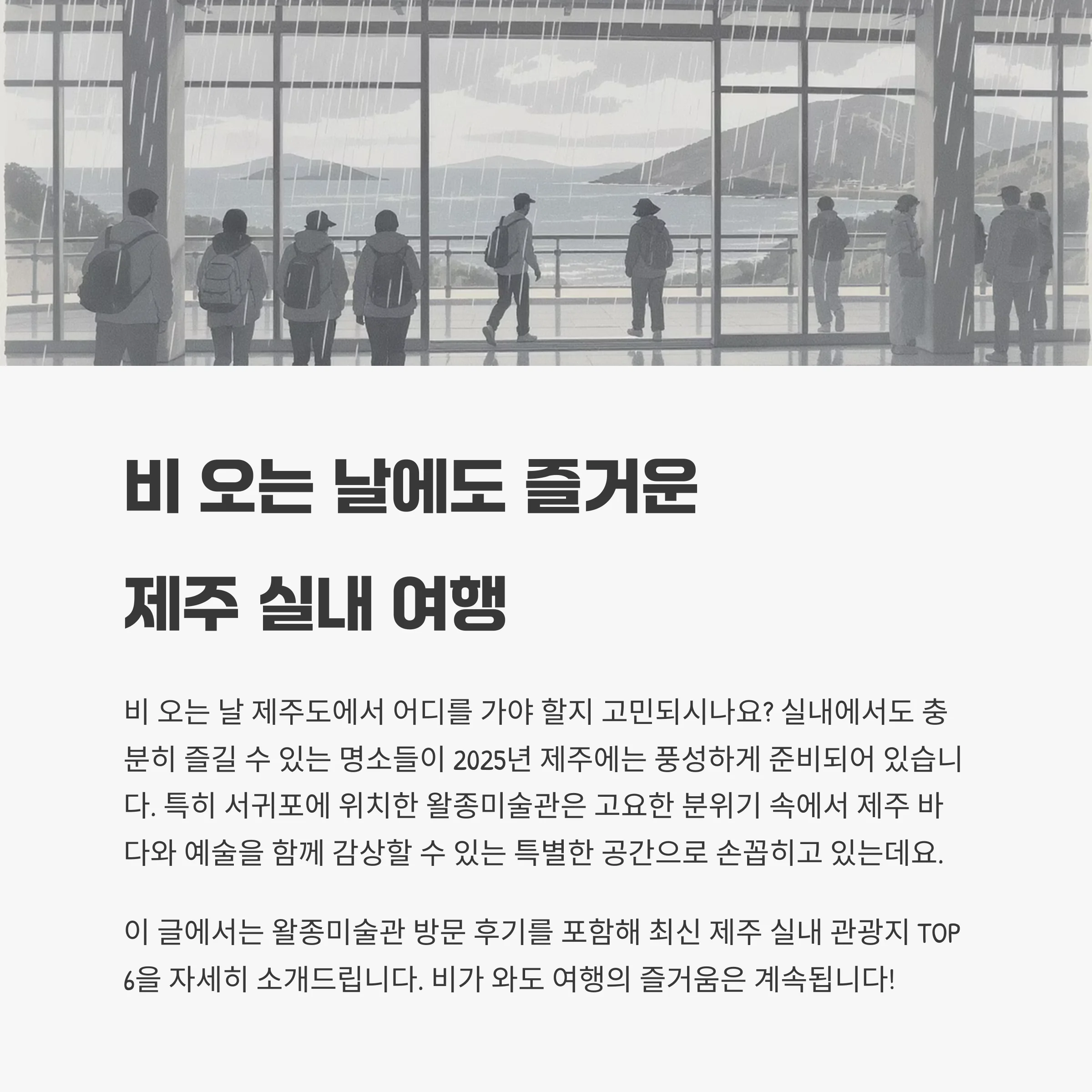 비 오는 날 제주도에서 어디를 가야 할지 고민되시나요? 실내에서도 충분히 즐길 수 있는 명소들이 2025년 제주에는 풍성하게 준비되어 있습니다. 특히 서귀포에 위치한 왈종미술관은 고요한 분위기 속에서 제주 바다와 예술을 함께 감상할 수 있는 특별한 공간으로 손꼽히고 있는데요. 이 글에서는 왈종미술관 방문 후기를 포함해 최신 제주 실내 관광지 TOP 6을 자세히 소개드립니다.