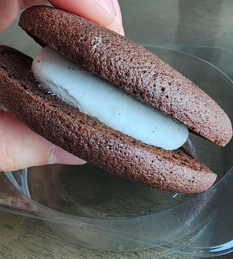 이 빵 맛은 위아래 초코빵에 바닐라 크림이 듬뿍 들어있는 샌드 느낌의 빵 입니다.