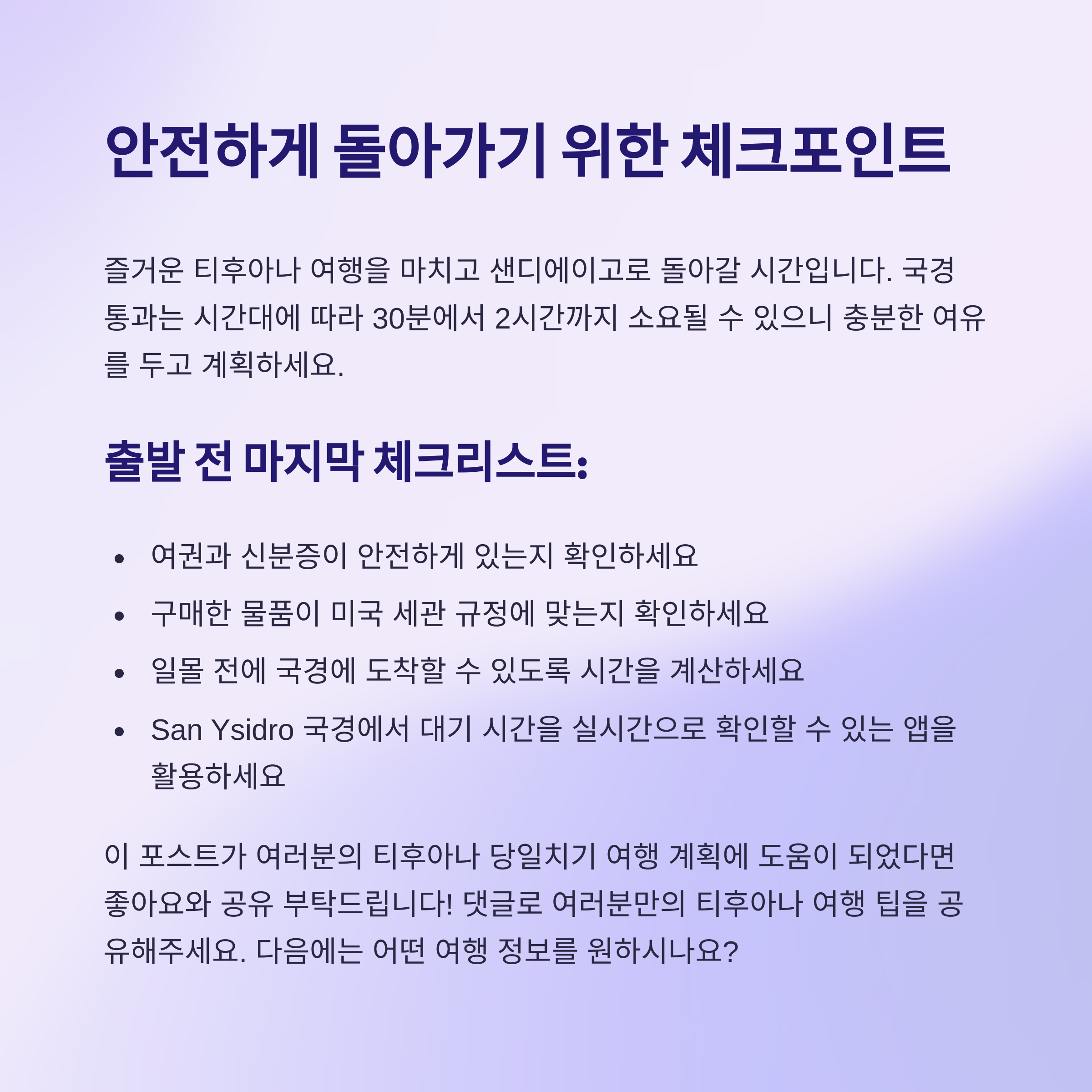 국경 통과는 San Ysidro Port of Entry를 통해 이루어지며, 약 30~60분(교통 혼잡 및 대기 시간에 따라) 정도가 소요됩니다.