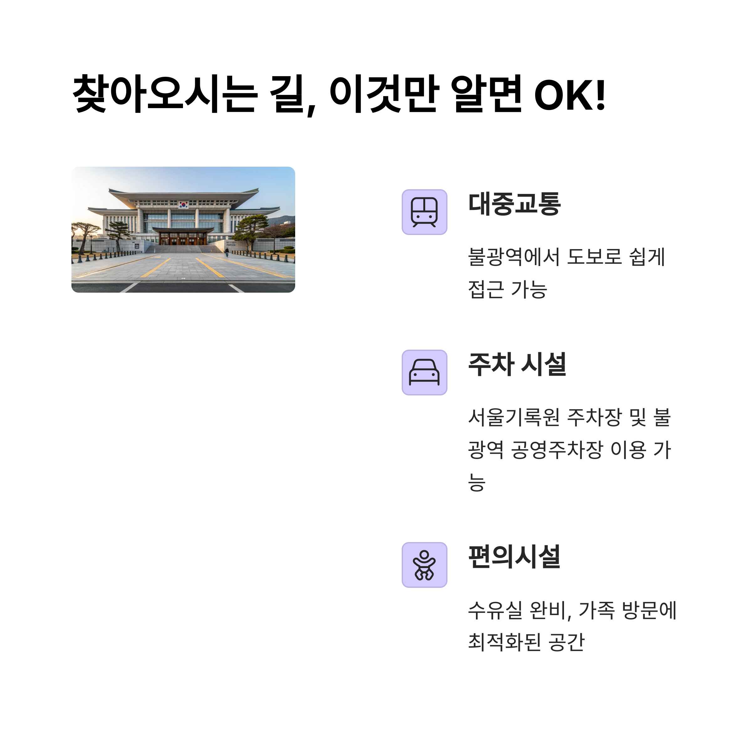 서울기록원은 불광역 2번 출구와 가까워 접근하기 쉽고 주차 공간도 넉넉합니다.