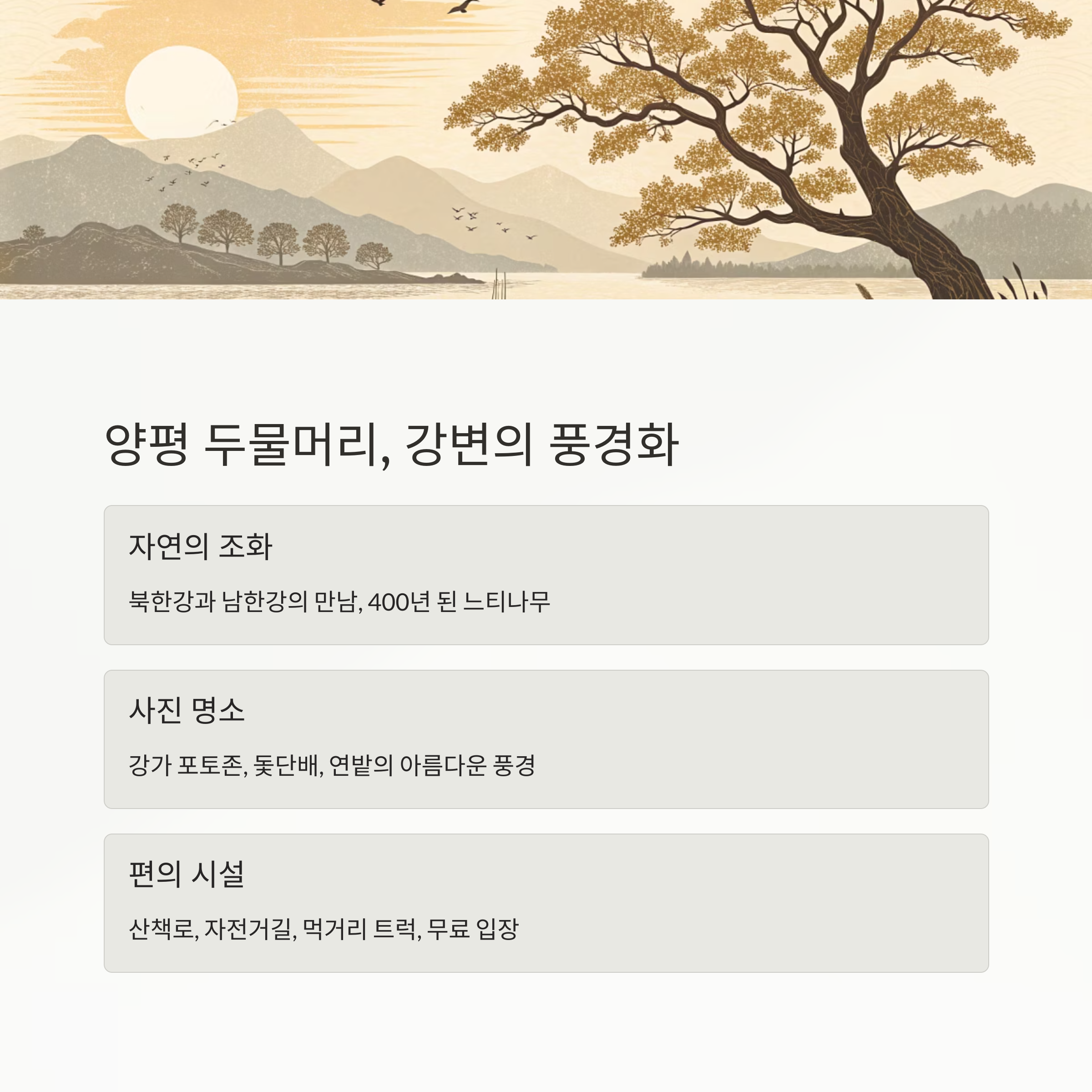| 두물머리 | 100만 명 | 무료 | 300+ | 1시간 | 느티나무, 강변 풍경 |