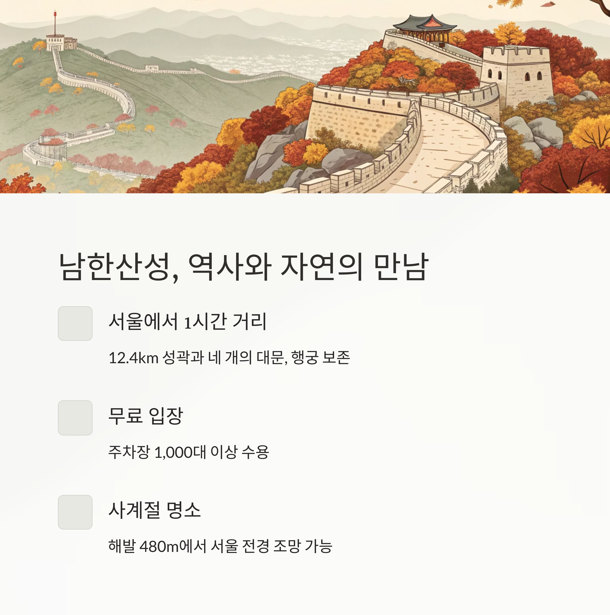 | 남한산성 | 200만 명 | 무료 | 1,000+ | 약 1시간 | 성곽, 등산, 조망 |
