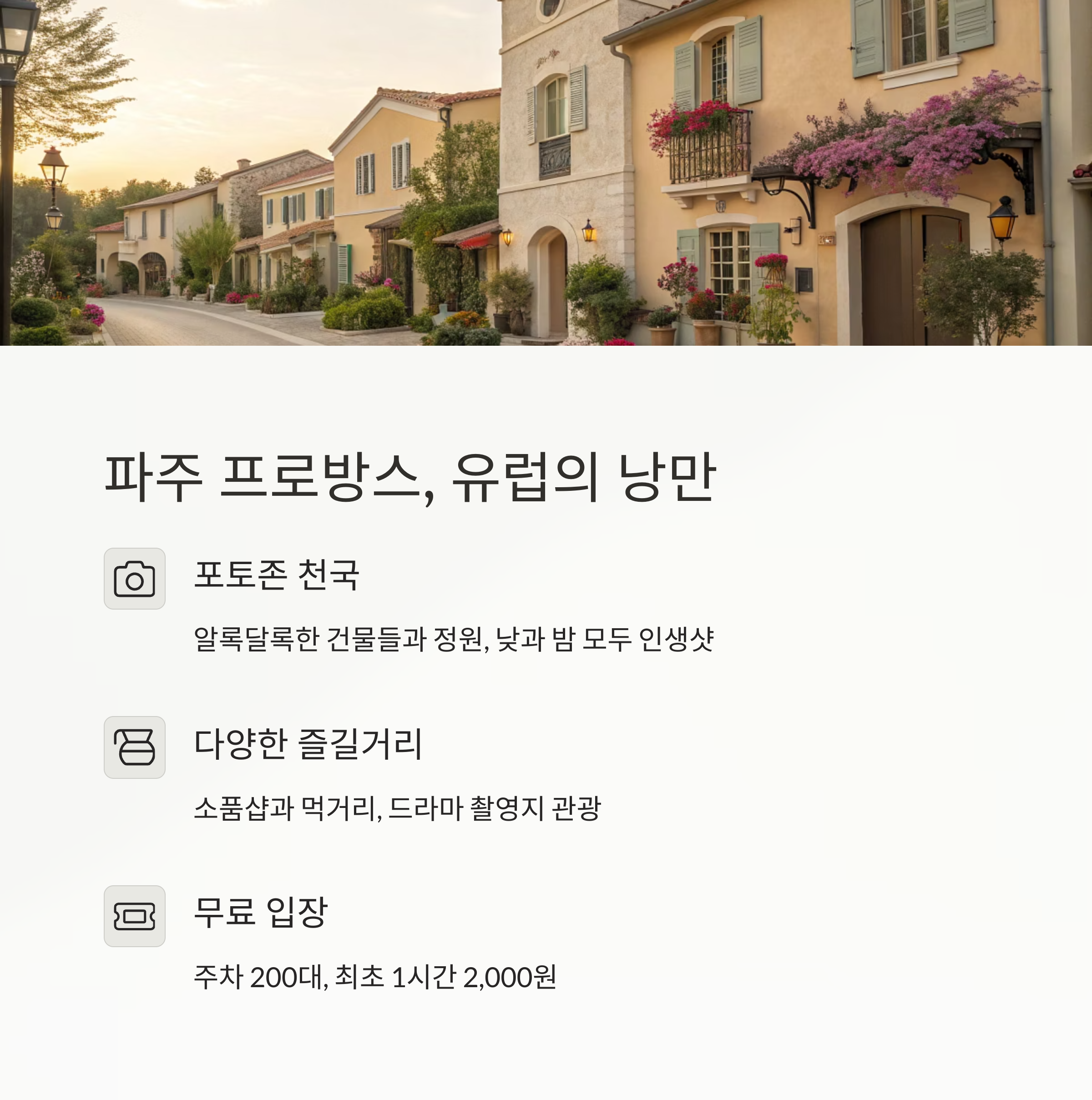 | 파주 프로방스 | 80만 명 | 무료 | 200+ | 1시간 | 유럽풍, 포토존 |