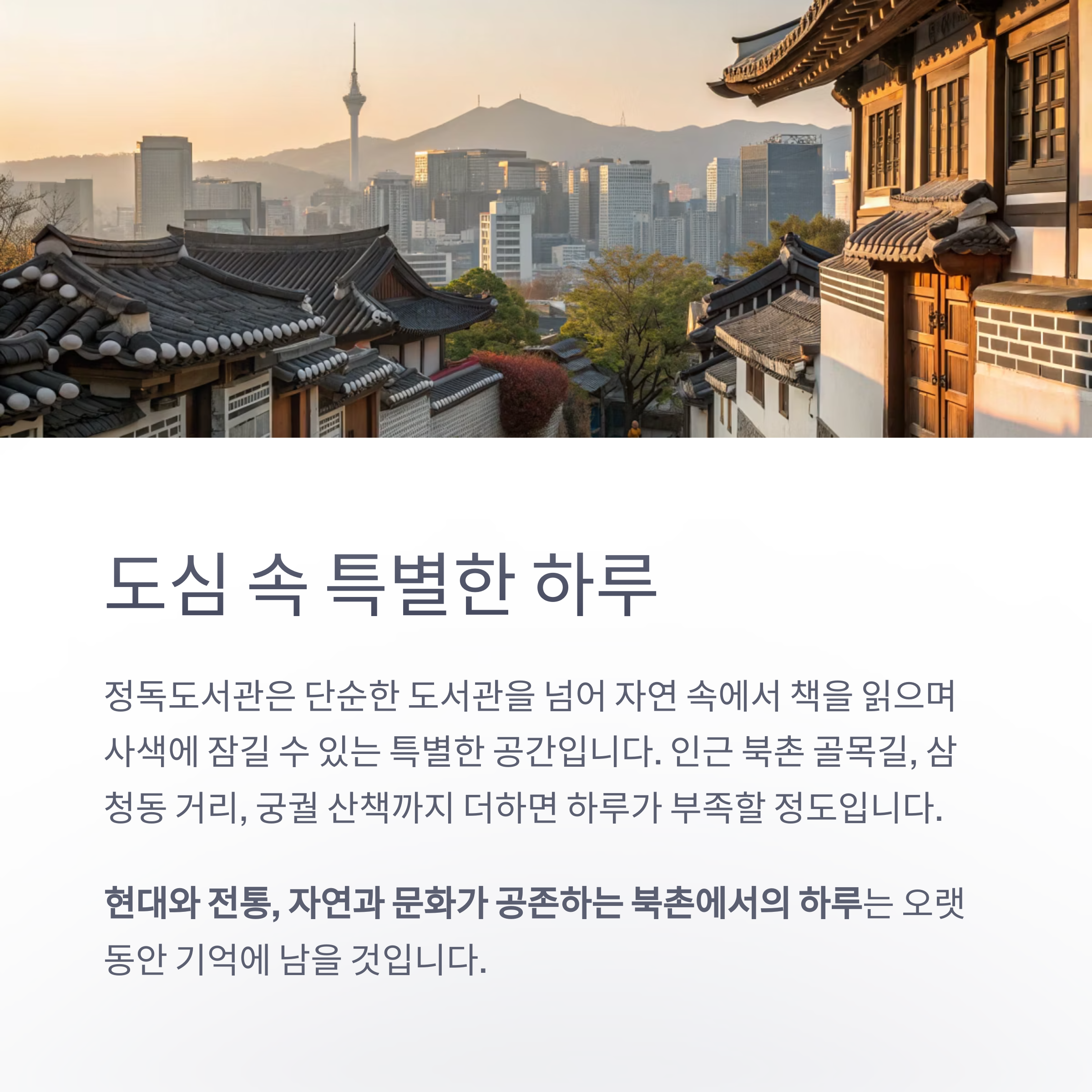 "정독도서관 근처 북촌 골목은 그냥 걷기만 해도 분위기에 취해요. 커피 한 잔, 책 한 권이면 하루가 짧습니다."