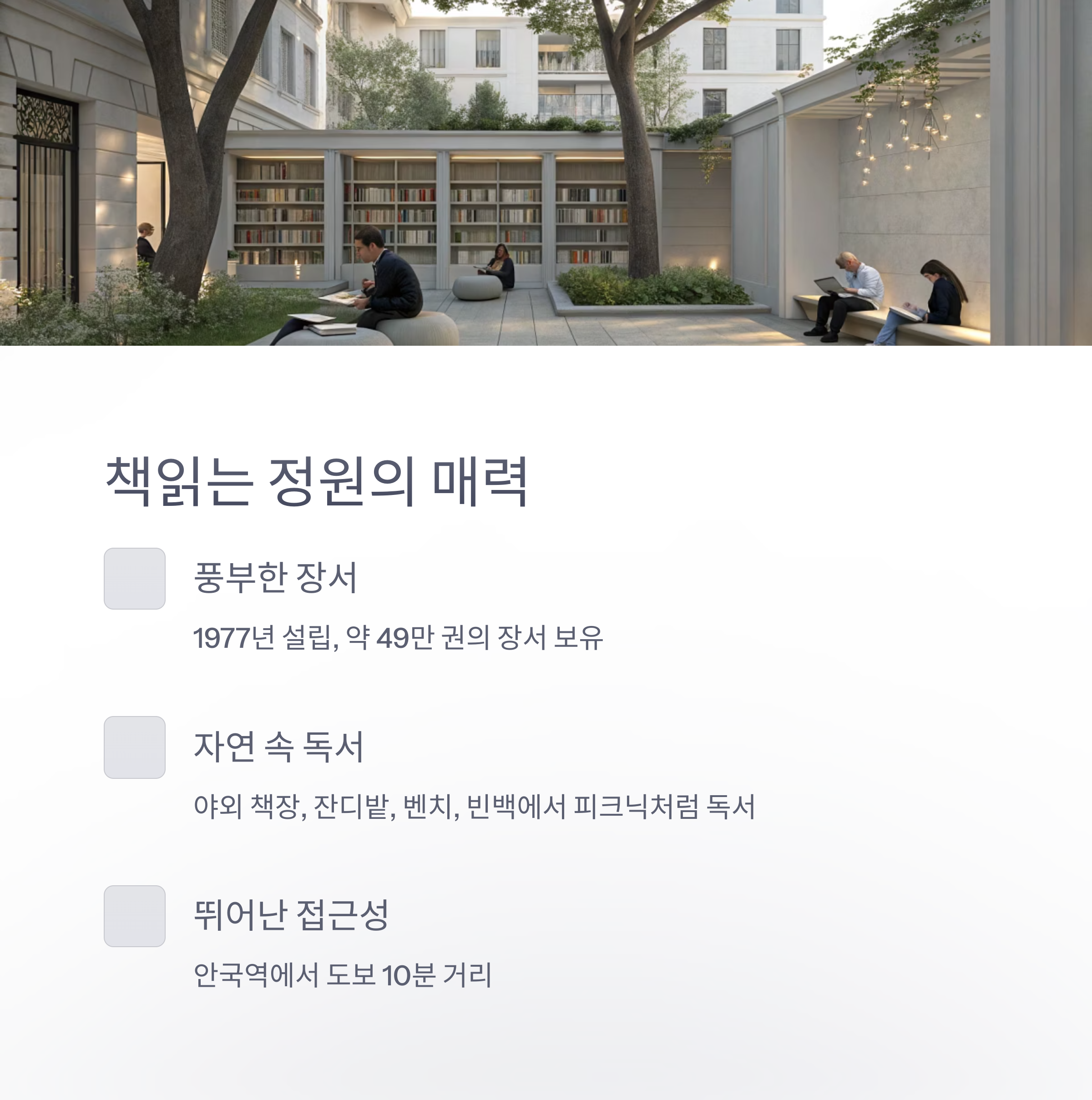 서울 종로구에 위치한 정독도서관은 1977년 설립되어 약 49만 권의 장서를 보유하고 있으며, 그 안의 ‘책읽는 정원’은 도심 속에서 자연과 함께 책을 읽을 수 있는 이색 공간입니다.
