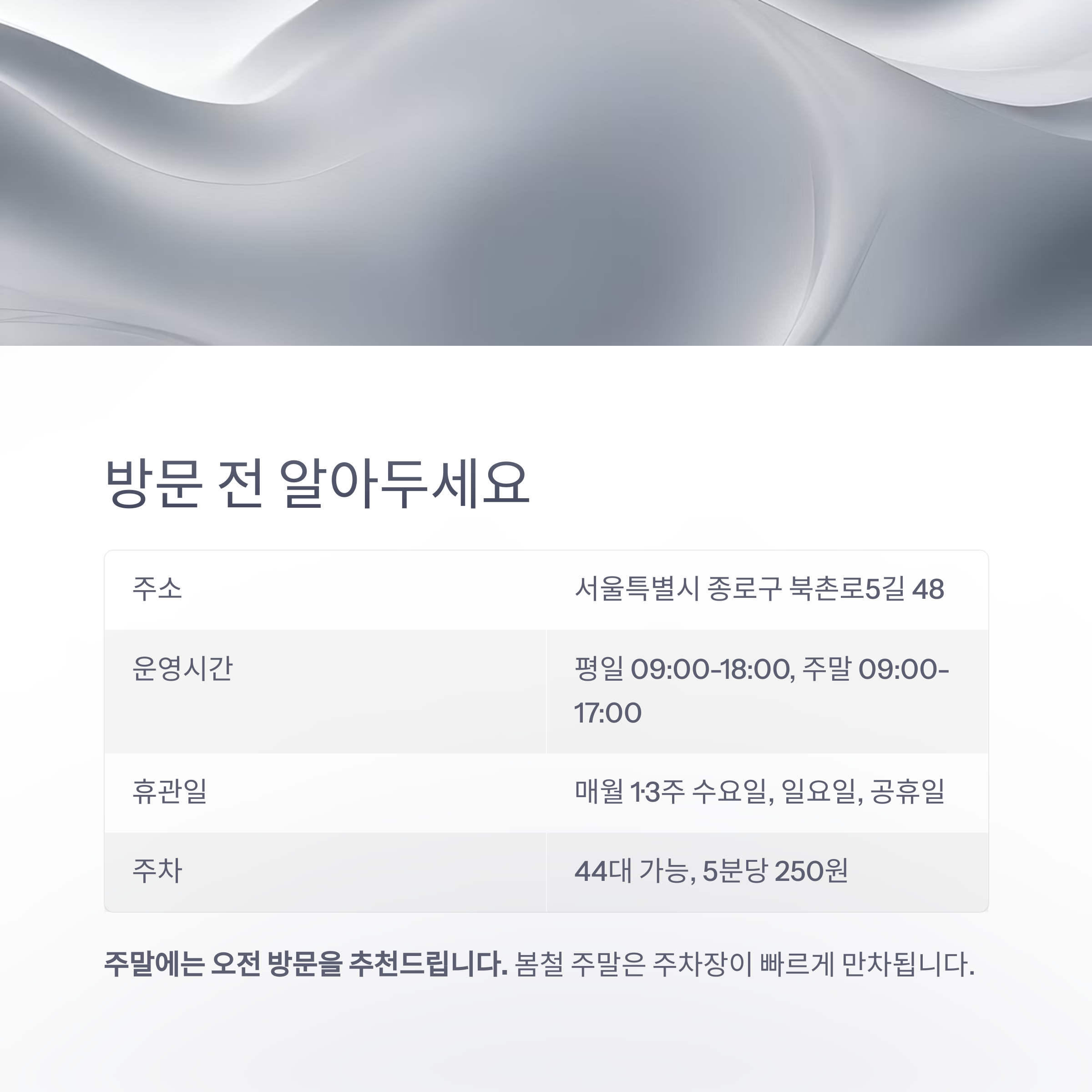 | 인근 명소 | 북촌 한옥마을, 삼청동, 창덕궁, 삼청공원 |